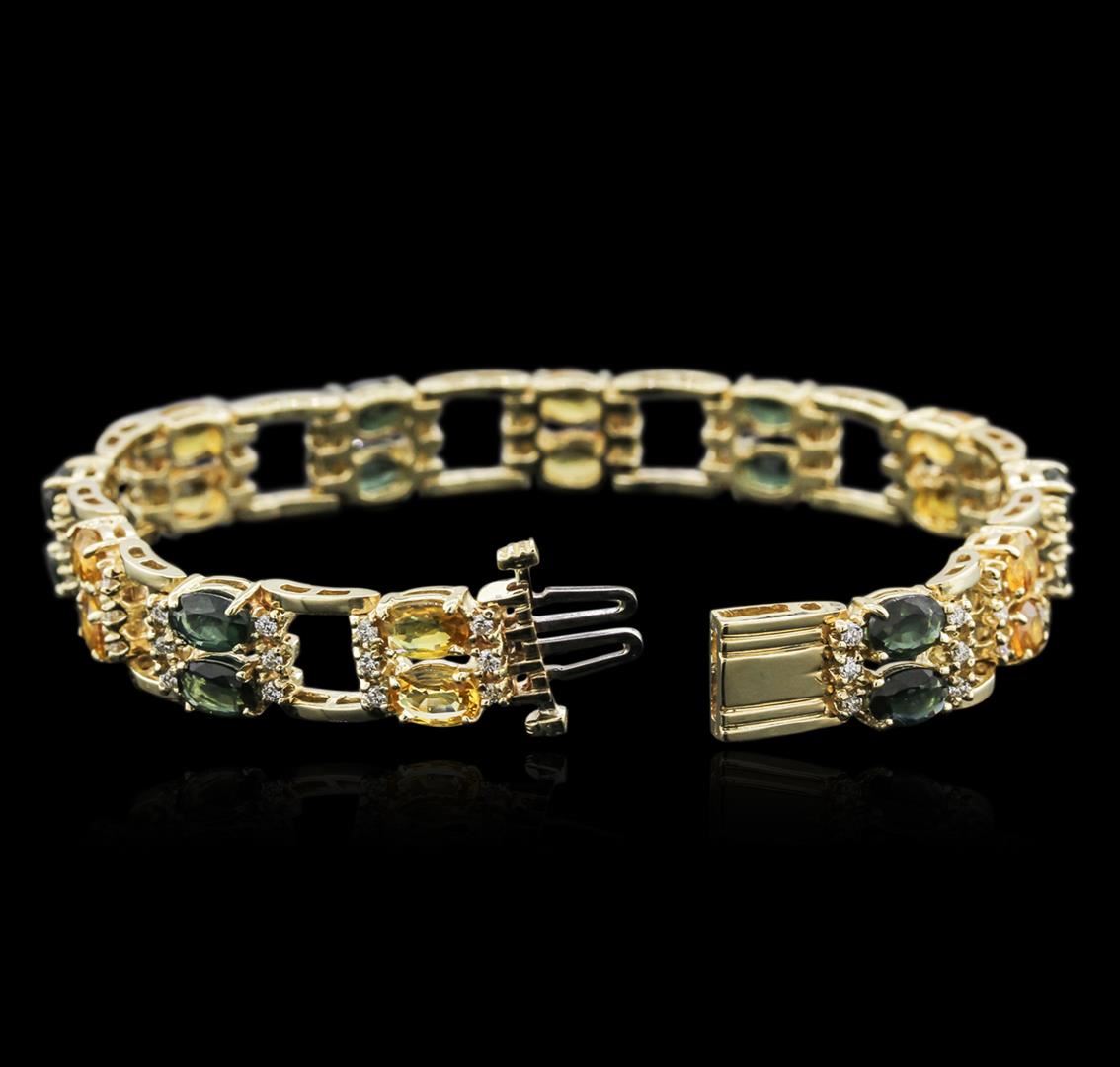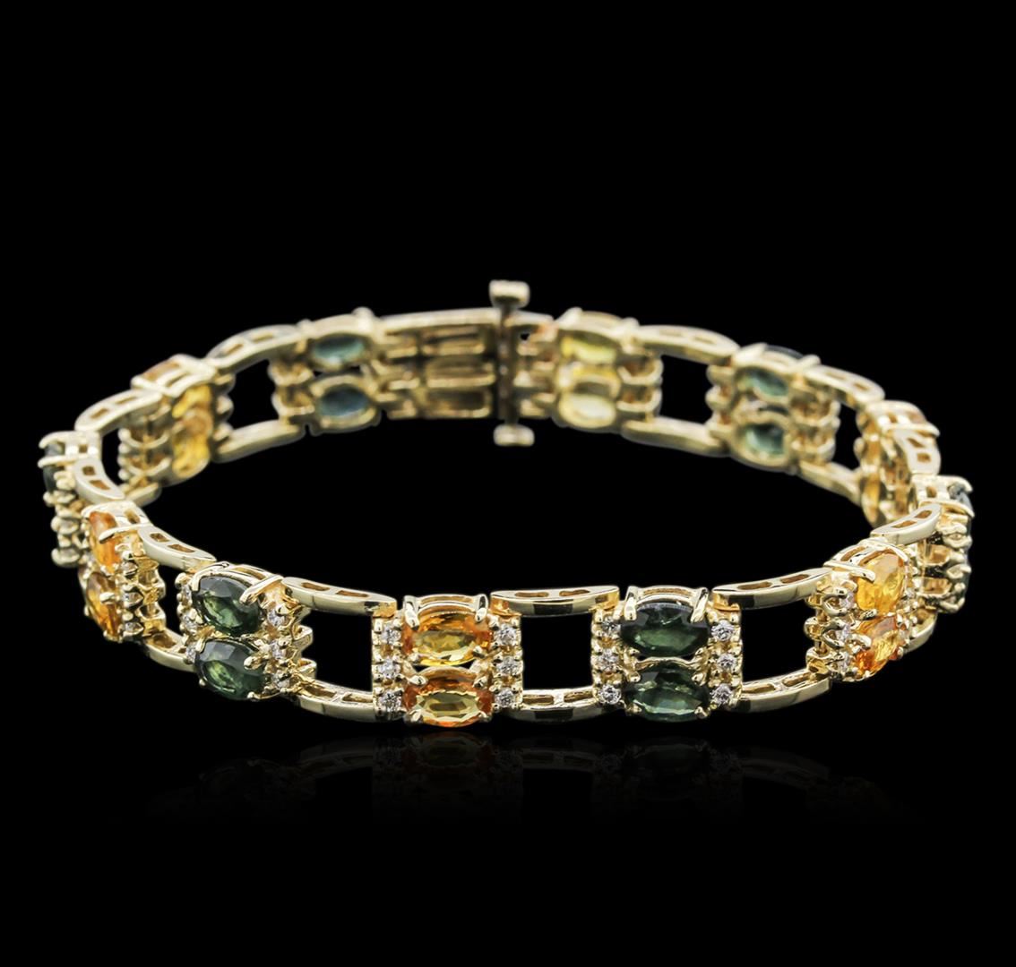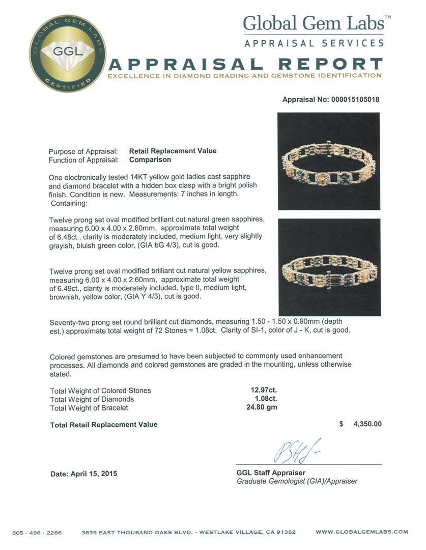 One electronically tested 14KT yellow gold ladies cast sapphire and diamond bracelet with a hidden box clasp with a bright polish finish. Measurements: 7 inches in length. Condition is new. Containing: Twelve prong set oval modified brilliant cut natural green sapphires, measuring 6.00. x 4.00. x 2.60mm, approximate total weight of 6.48ct., clarity is moderately included, medium light, very slightly grayish, bluish green color, (GIA bG 4/3), cut is good. Twelve prong set oval modified brilliant cut natural yellow sapphires, measuring 6.00. x 4.00. x 2.60mm, approximate total weight of 6.49ct., clarity is moderately included, type II, medium light, brownish, yellow color, (GIA Y 4/3), cut is good. Seventy-Two prong set round brilliant cut diamonds, measuring 1.50 - 1.50 x 0.90mm (depth est.) approximate total weight of 72 Stones = 1.08ct. Clarity: SI-1. Color: J - K, Cut is Good. Colored gemstones are presumed to have been subjected to commonly used enhancement processes. All diamonds and colored gemstones are graded in the mounting, unless otherwise stated. Total Weight of Colored Stones 12.97ct. Total Weight of Diamonds 1.08ct. Total Weight of Bracelet 24.80 grams. GGL Appraised at $4,350.00.