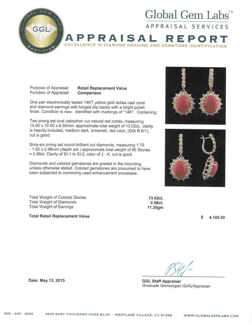 One pair electronically tested 14KT yellow gold ladies cast coral and diamond earrings with hinged clip backs with a bright polish finish. Identified with markings of "14K". Condition is new. Containing: Two prong set oval cabochon cut natural red corals, measuring 14.00 x 10.00 x 6.50mm, approximate total weight of 13.02ct., clarity is heavily included, medium dark, brownish, red color, (GIA R 6/1), cut is good. Sixty-Six prong set round brilliant cut diamonds, measuring 1.70 - 1.50 x 0.96mm (depth est.) approximate total weight of 66 Stones = 0.98ct. Clarity: SI-1 to SI-2. Color: J - K, Cut is Good. Diamonds and colored gemstones are graded in the mounting, unless otherwise stated. Colored gemstones are presumed to have been subjected to commonly used enhancement processes. Total Weight of Colored Stones 13.02ct. Total Weight of Diamonds 0.98ct. Total Weight of Earrings 11.30 grams. GGL Appraised at $4,100.00.