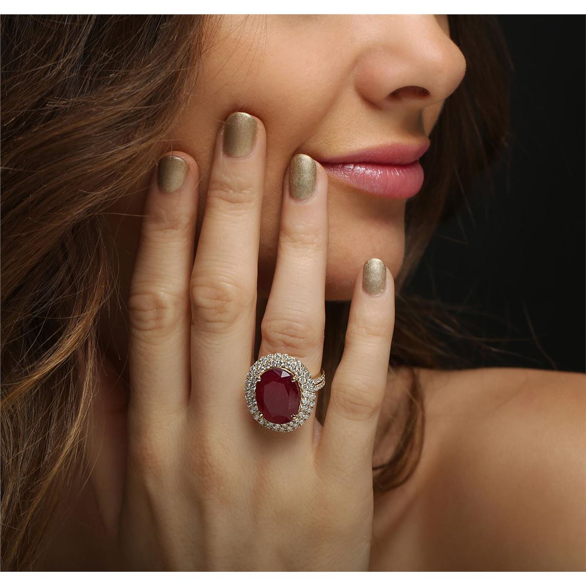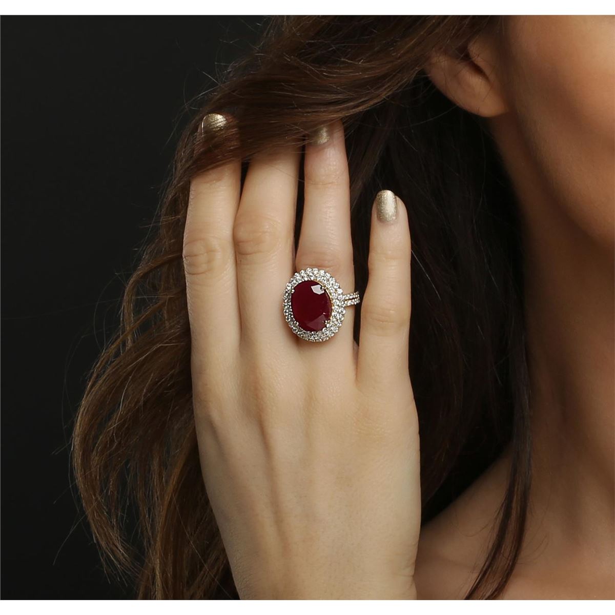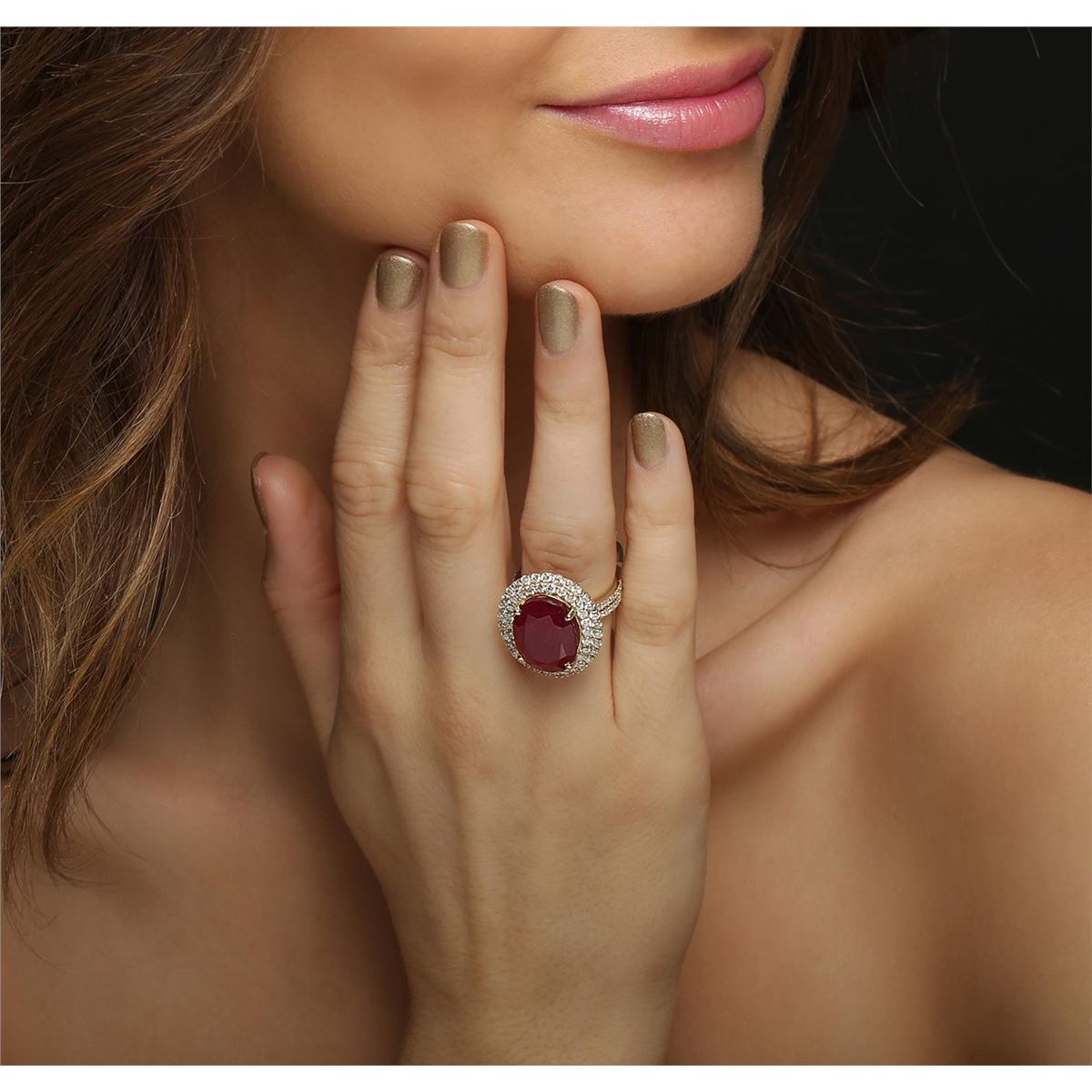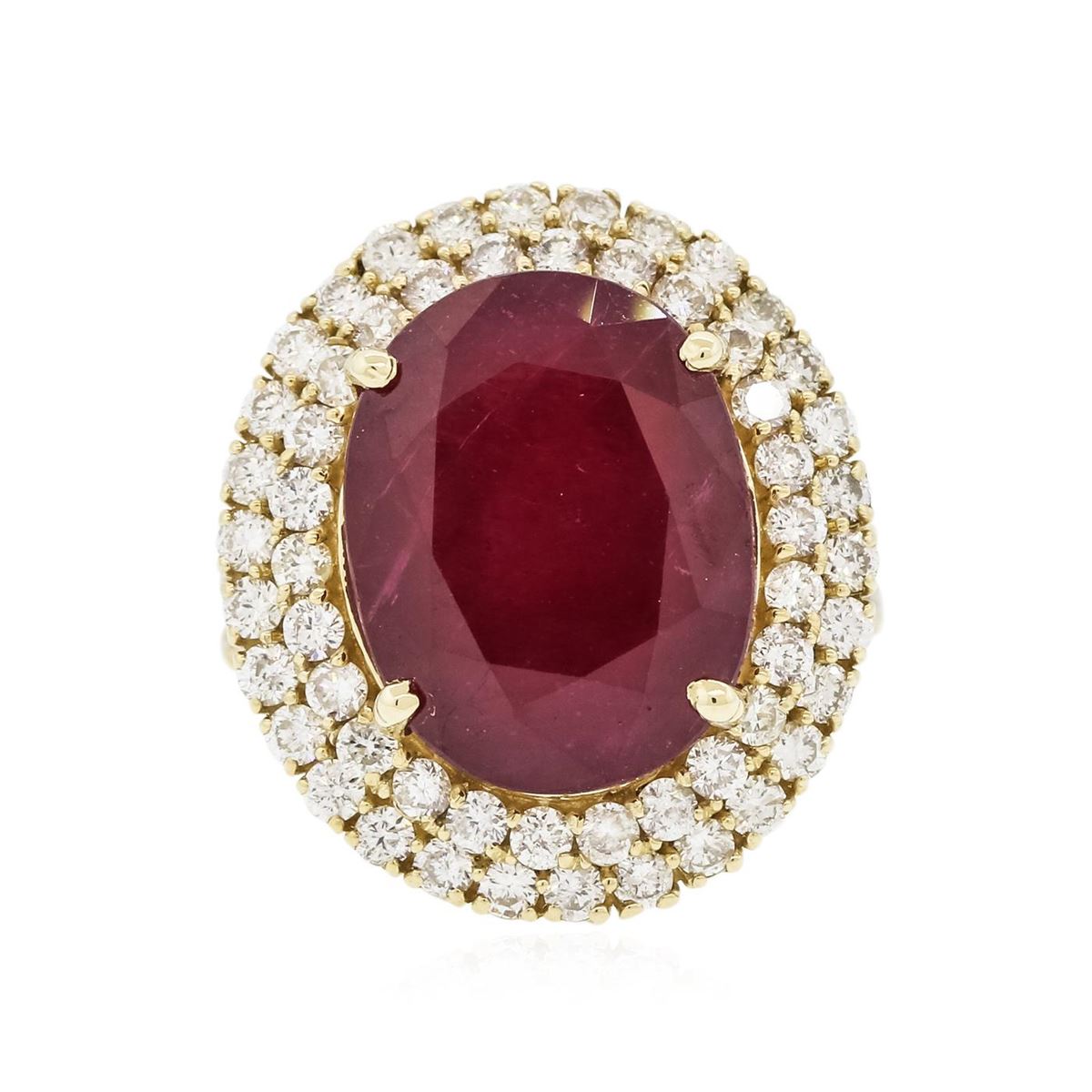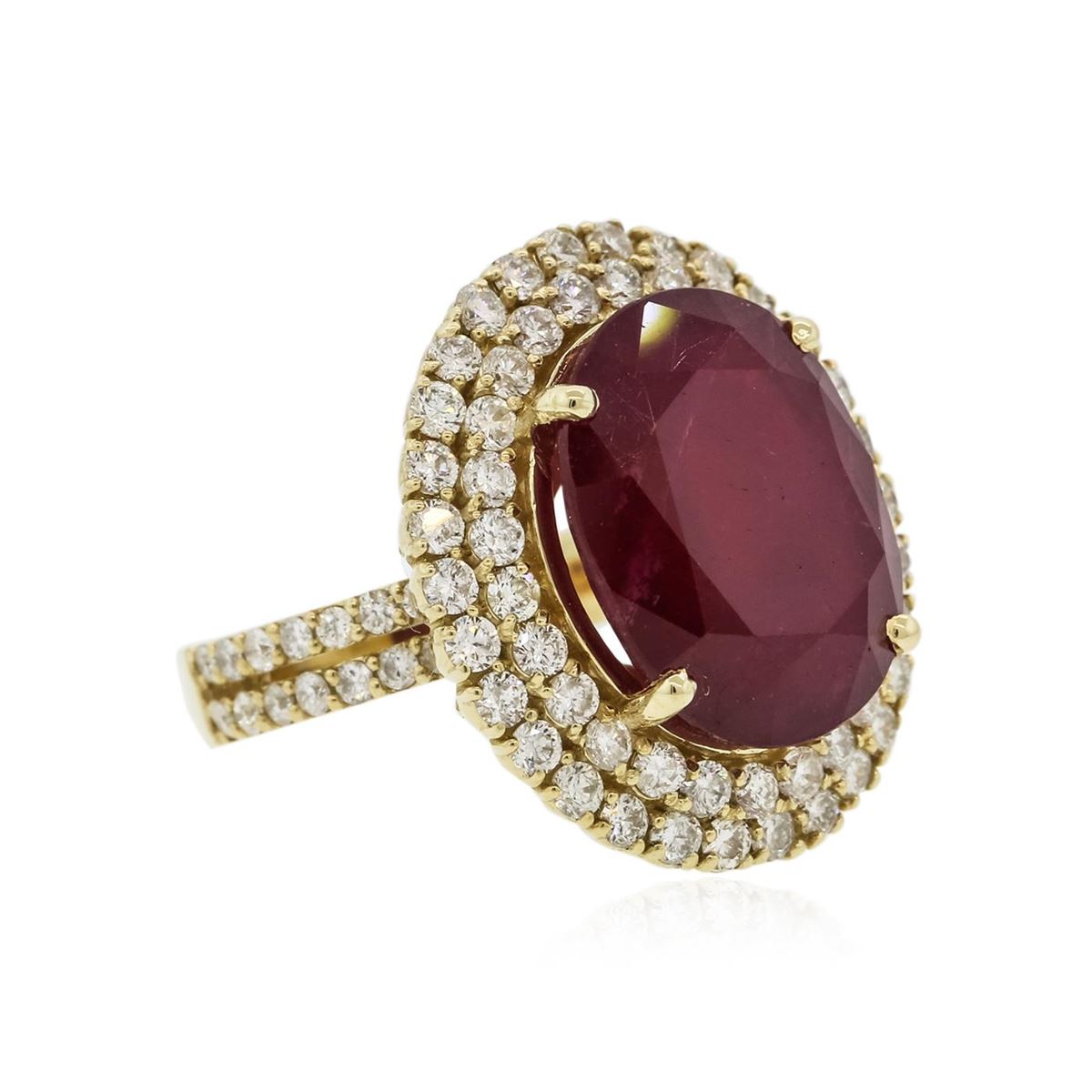 One electronically tested 14KT yellow gold ladies cast ruby and diamond ring with a bright polish finish. The featured ruby is set within two tiered diamond bezels supported by diamond set split shoulders, completed by three and one-half millimeter wide band. Identified with markings of "14K". Condition is new, good workmanship. Containing: One prong set oval mixed cut natural ruby, measuring 16.20 x 12.40 x 7.40mm, 8% bulge factor, approximate weight of 13.07ct., clarity is heavily included, type II, dark, very slightly brownish, slightly purplish red color, (GIA slpR 7/3), cut is good. Transmitting light somewhat diffusely, transparent to translucent. Naturally occurring internal & external characteristics are present. Indications of laboratory high temperature heat treatment, with glass & flux additives. Graded in the setting. Ruby has a low tolerance to rhodium plating, repolishing the surface, & ultrasonic cleaning. Eighty-Four prong set round brilliant cut diamonds, measuring 1.90 - 1.50 x 1.02mm (depth est.) approximate total weight of 84 Stones = 1.60ct. Graded in the setting. Clarity: I-1 to I-2. Color: G - I. Total Weight of Colored Stones 13.07ct. Total Weight of Diamonds 1.60ct. Total Weight of Ring 11.88 grams. AIG Appraised at $8,025.00.