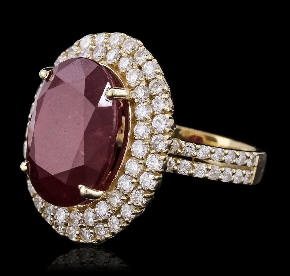 One electronically tested 14KT yellow gold ladies cast ruby and diamond ring with a bright polish finish. The featured ruby is set within two tiered diamond bezels supported by diamond set split shoulders, completed by three and one-half millimeter wide band. Identified with markings of "14K". Condition is new, good workmanship. Containing: One prong set oval mixed cut natural ruby, measuring 16.20 x 12.40 x 7.40mm, 8% bulge factor, approximate weight of 13.07ct., clarity is heavily included, type II, dark, very slightly brownish, slightly purplish red color, (GIA slpR 7/3), cut is good. Transmitting light somewhat diffusely, transparent to translucent. Naturally occurring internal & external characteristics are present. Indications of laboratory high temperature heat treatment, with glass & flux additives. Graded in the setting. Ruby has a low tolerance to rhodium plating, repolishing the surface, & ultrasonic cleaning. Eighty-Four prong set round brilliant cut diamonds, measuring 1.90 - 1.50 x 1.02mm (depth est.) approximate total weight of 84 Stones = 1.60ct. Graded in the setting. Clarity: I-1 to I-2. Color: G - I. Total Weight of Colored Stones 13.07ct. Total Weight of Diamonds 1.60ct. Total Weight of Ring 11.88 grams. AIG Appraised at $8,025.00.