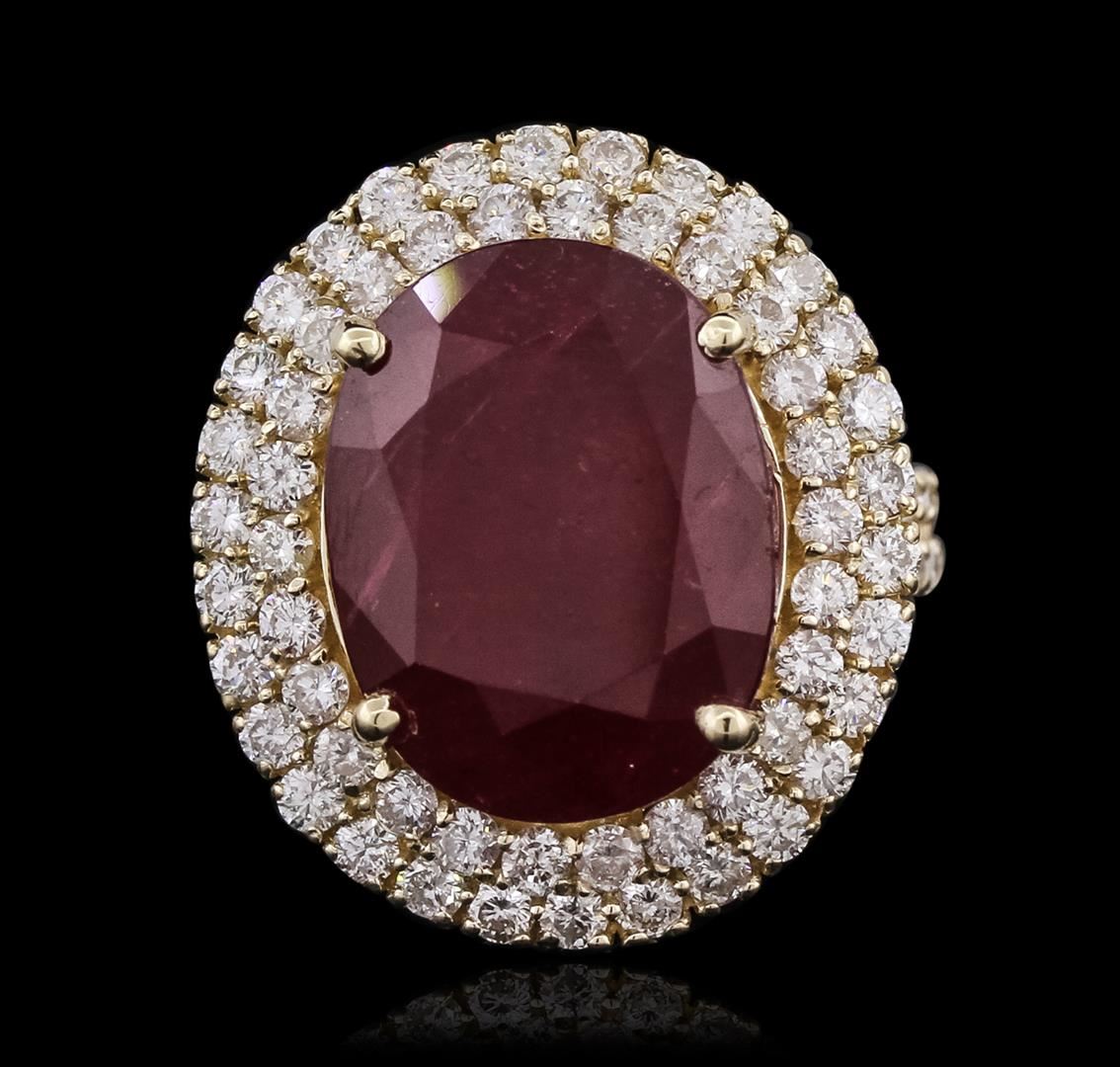 One electronically tested 14KT yellow gold ladies cast ruby and diamond ring with a bright polish finish. The featured ruby is set within two tiered diamond bezels supported by diamond set split shoulders, completed by three and one-half millimeter wide band. Identified with markings of "14K". Condition is new, good workmanship. Containing: One prong set oval mixed cut natural ruby, measuring 16.20 x 12.40 x 7.40mm, 8% bulge factor, approximate weight of 13.07ct., clarity is heavily included, type II, dark, very slightly brownish, slightly purplish red color, (GIA slpR 7/3), cut is good. Transmitting light somewhat diffusely, transparent to translucent. Naturally occurring internal & external characteristics are present. Indications of laboratory high temperature heat treatment, with glass & flux additives. Graded in the setting. Ruby has a low tolerance to rhodium plating, repolishing the surface, & ultrasonic cleaning. Eighty-Four prong set round brilliant cut diamonds, measuring 1.90 - 1.50 x 1.02mm (depth est.) approximate total weight of 84 Stones = 1.60ct. Graded in the setting. Clarity: I-1 to I-2. Color: G - I. Total Weight of Colored Stones 13.07ct. Total Weight of Diamonds 1.60ct. Total Weight of Ring 11.88 grams. AIG Appraised at $8,025.00.