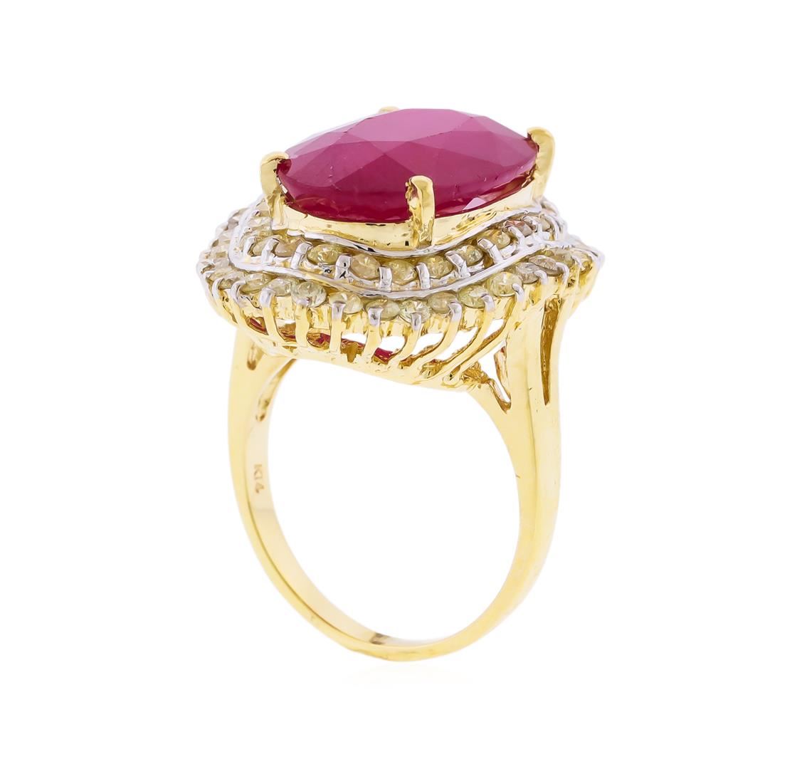 One fourteen karat (14K) yellow gold ruby and diamond ring. An oval cut ruby corundum gemstone weighing 13.19 carats is prong mounted in the center of the ring. Sixty-two round brilliant cut diamonds with an average clarity of SI2-I1, average color of H-J, weighing 1.72 carats accent the ring around the center gemstone. The ring is cast stamped "14K" and has a gross weight of 12.2 Grams. GGA Appraised at $11,270.00.