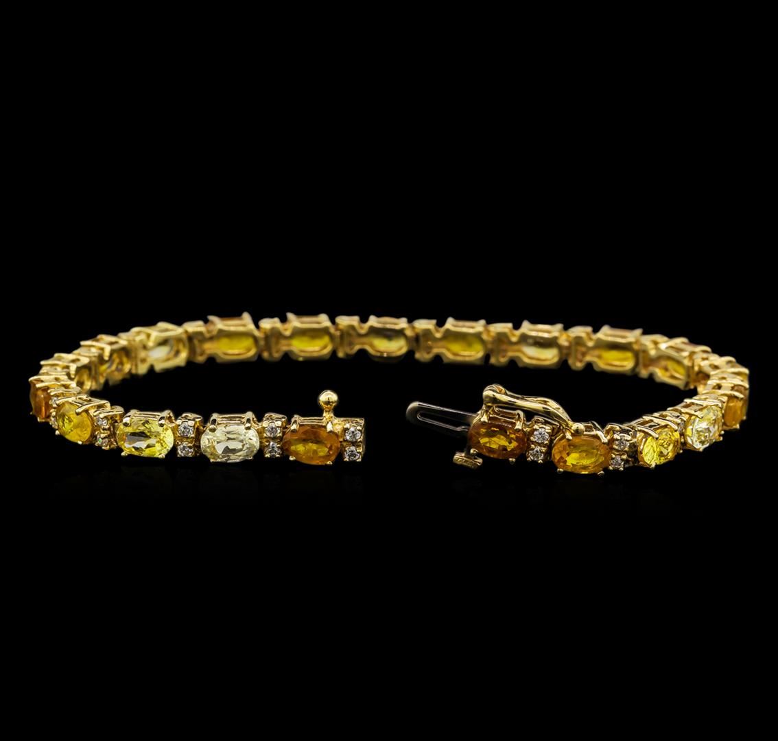 One electronically tested 14KT yellow gold ladies cast sapphire and diamond bracelet with a hidden box clasp with safety closer with a bright polish finish. Measurements: 7" in length. Identified with markings of "14K". Condition is new. Containing: Twenty-one prong set oval modified brilliant cut natural yellow sapphires, measuring 6.50 x 4.20 x 2.73mm, approximate total weight of 13.23ct., clarity is slightly included, type II, medium light, brownish, yellow color, (GIA Y 4/3), cut is good. Forty-Two prong set round brilliant cut diamonds, measuring 1.30 - 1.30 x 0.78mm (depth est.) approximate total weight of 42 Stones = 0.34ct. Clarity: SI-1 to SI-2. Color: J - K, Cut is Good. Colored gemstones are presumed to have been subjected to commonly used enhancement processes. All diamonds and colored gemstones are graded in the mounting, unless otherwise stated. Total Weight of Colored Stones 13.23ct. Total Weight of Diamonds 0.34ct. Total Weight of Bracelet 13.40 grams. GGL Appraised at $3,870.00.