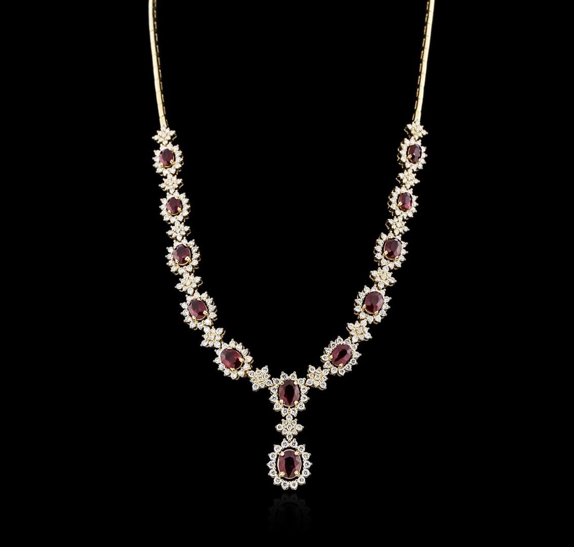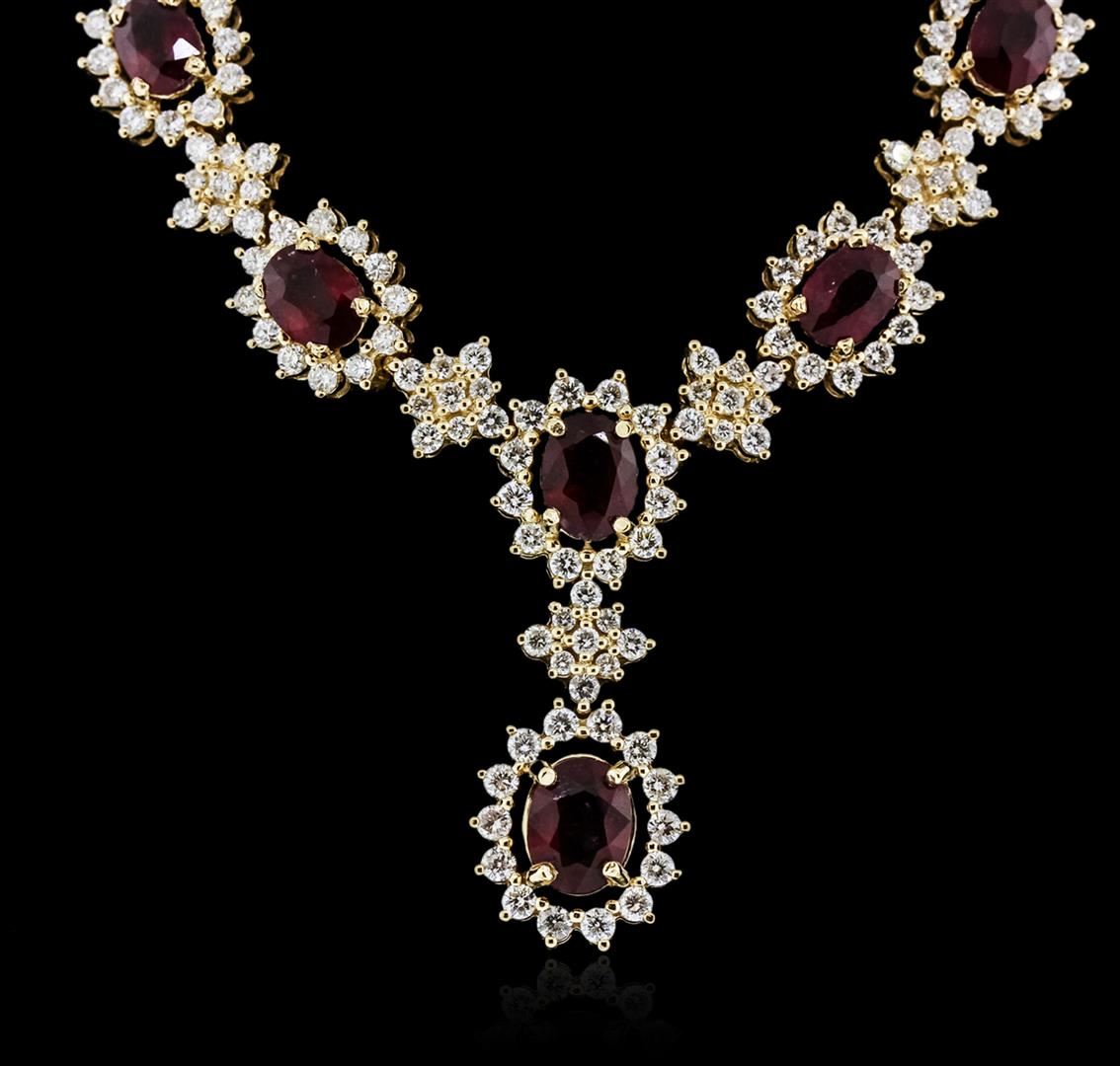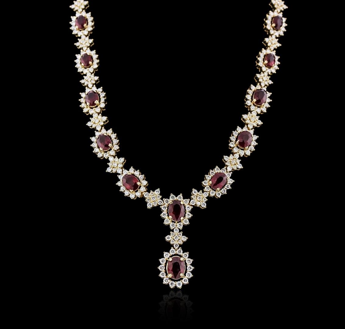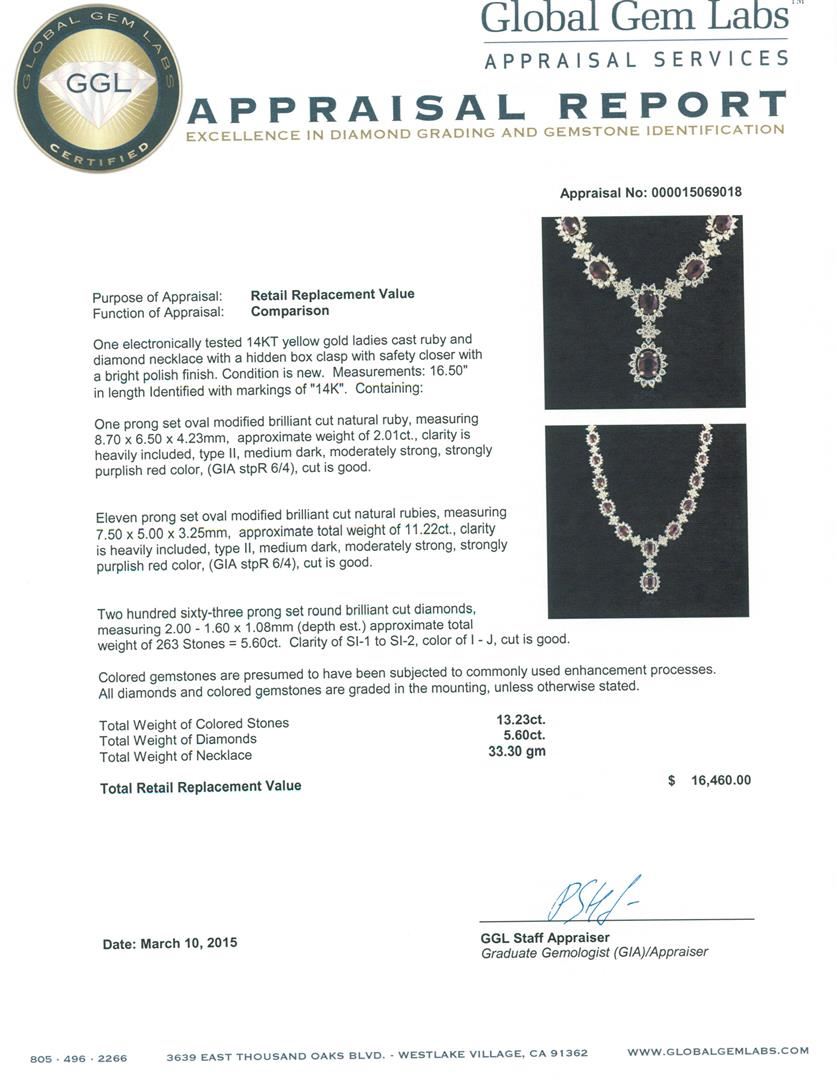 One electronically tested 14KT yellow gold ladies cast ruby and diamond necklace with a hidden box clasp with safety closer with a bright polish finish. Measurements: 16.50" in length Identified with markings of "14K". Condition is new. Containing: One prong set oval modified brilliant cut natural ruby, measuring 8.70 x 6.50 x 4.23mm, approximate weight of 2.01ct., clarity is heavily included, type II, medium dark, moderately strong, strongly purplish red color, (GIA stpR 6/4), cut is good. Eleven prong set oval modified brilliant cut natural rubies, measuring 7.50 x 5.00 x 3.25mm, approximate total weight of 11.22ct., clarity is heavily included, type II, medium dark, moderately strong, strongly purplish red color, (GIA stpR 6/4), cut is good. Two Hundred Sixty-Three prong set round brilliant cut diamonds, measuring 2.00 - 1.60 x 1.08mm (depth est.) approximate total weight of 263 Stones = 5.60ct. Clarity: SI-1 to SI-2. Color: I - J, Cut is Good. Colored gemstones are presumed to have been subjected to commonly used enhancement processes. All diamonds and colored gemstones are graded in the mounting, unless otherwise stated. Total Weight of Colored Stones 13.23ct. Total Weight of Diamonds 5.60ct. Total Weight of Necklace 33.30 grams. GGL Appraised at $16,460.00.