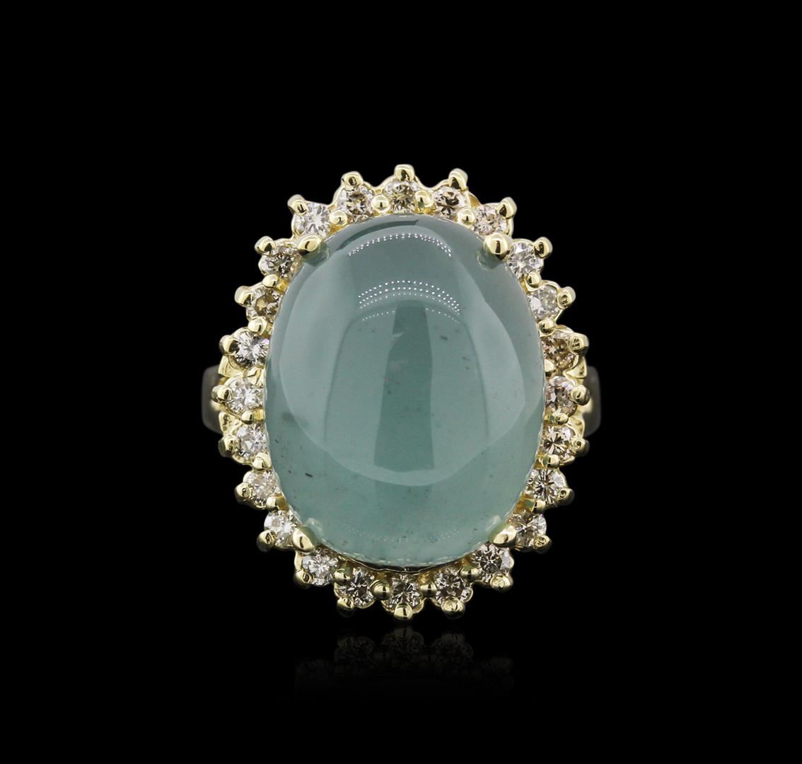 One electronically tested 14KT yellow gold ladies cast aquamarine and diamond ring with a split shoulder shank with a bright polish finish. Identified with markings of "14K". Condition is new. Containing: One prong set oval cabochon modified brilliant cut natural aquamarine, measuring 15.57 x 12.51 x 8.13mm, approximate weight of 13.35ct., clarity is heavily included, type I, medium light, very slightly grayish, blue color, (GIA B 4/3), cut is good. Twenty-Four prong set round brilliant cut diamonds, measuring 1.50 - 1.50 x 0.90mm (depth est.) approximate total weight of 24 Stones = 0.30ct. Clarity: SI-1 to SI-2. Color: L - M, Cut is Good. Diamonds and colored gemstones are graded in the mounting, unless otherwise stated. Colored gemstones are presumed to have been subjected to commonly used enhancement processes. Total Weight of Colored Stones 13.35ct. Total Weight of Diamonds 0.30ct. Total Weight of Ring 8.00 grams. GGL Appraised at $3,430.00.