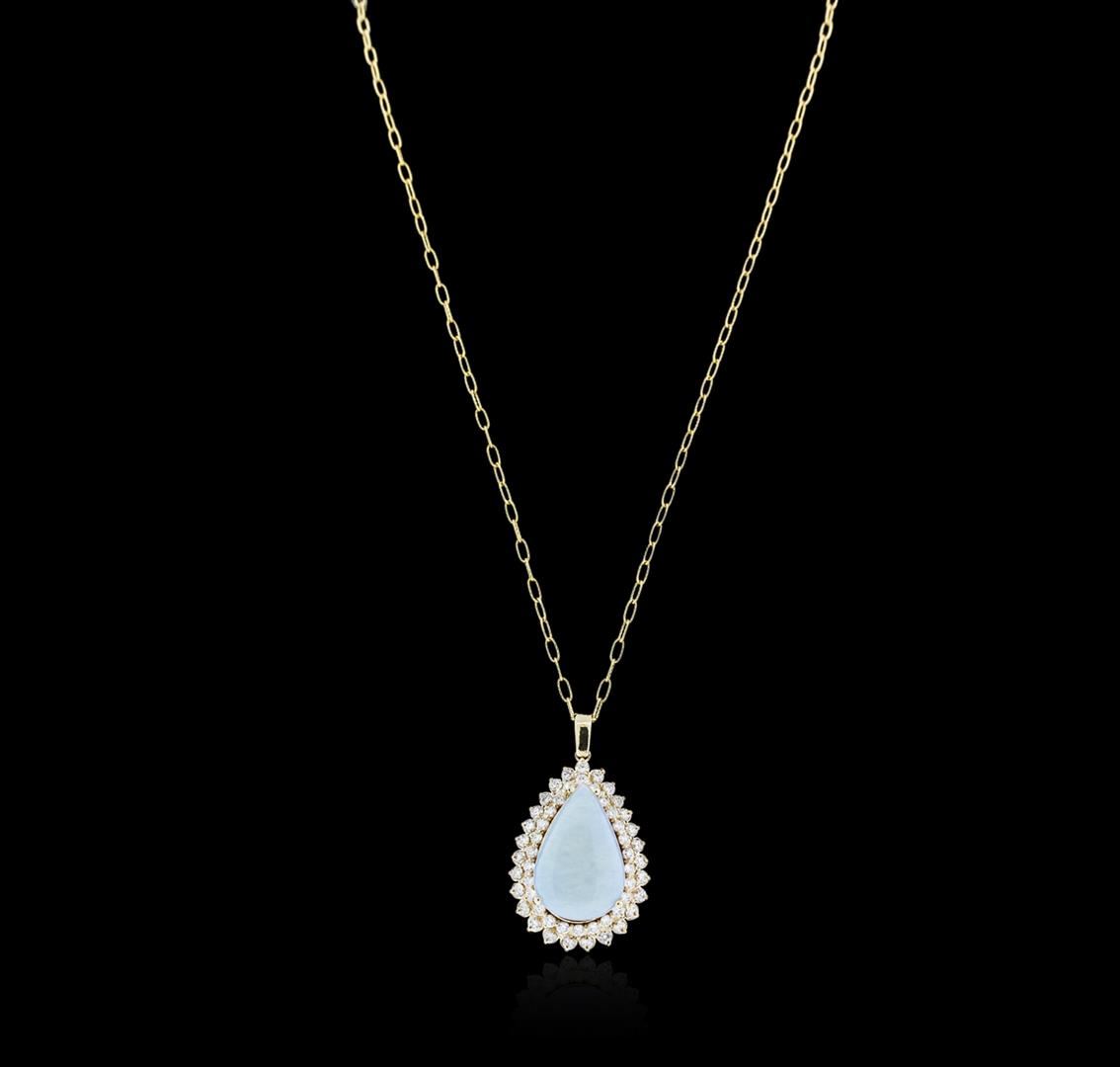 One electronically tested 14KT yellow gold ladies cast opal and diamond pendant & chain 18.0" long, with a lobster claw clasp with a bright polish finish. Identified with markings of "14K". Condition is new. Containing: One white opal that is cut in a pear shape and is prong set, measuring 25.49 mm long x 16.94 mm wide, and 8.00 mm thick and the approximate weight is 13.37 carats. The opal has a dull, blue-green play of color (fire) in a pattern; a medium dome; a good cut; no inclusions; consistent in its brightness and pattern; and is somewhat directional. Fifty-Three prong set round brilliant cut diamonds, measuring 2.50 - 2.20 x 1.41mm (depth est.) approximate total weight of 53 Stones = 2.52ct. Clarity: SI-1 to I-1. Color: I - K, Cut is Good. Colored gemstones are presumed to have been subjected to commonly used enhancement processes. All diamonds and colored gemstones are graded in the mounting, unless otherwise stated. Total Weight of Diamonds 2.52ct. Total Weight of Opals 13.37ct. Total Weight of Pendant & Chain 20.10 grams. GGL Appraised at $7,990.00.