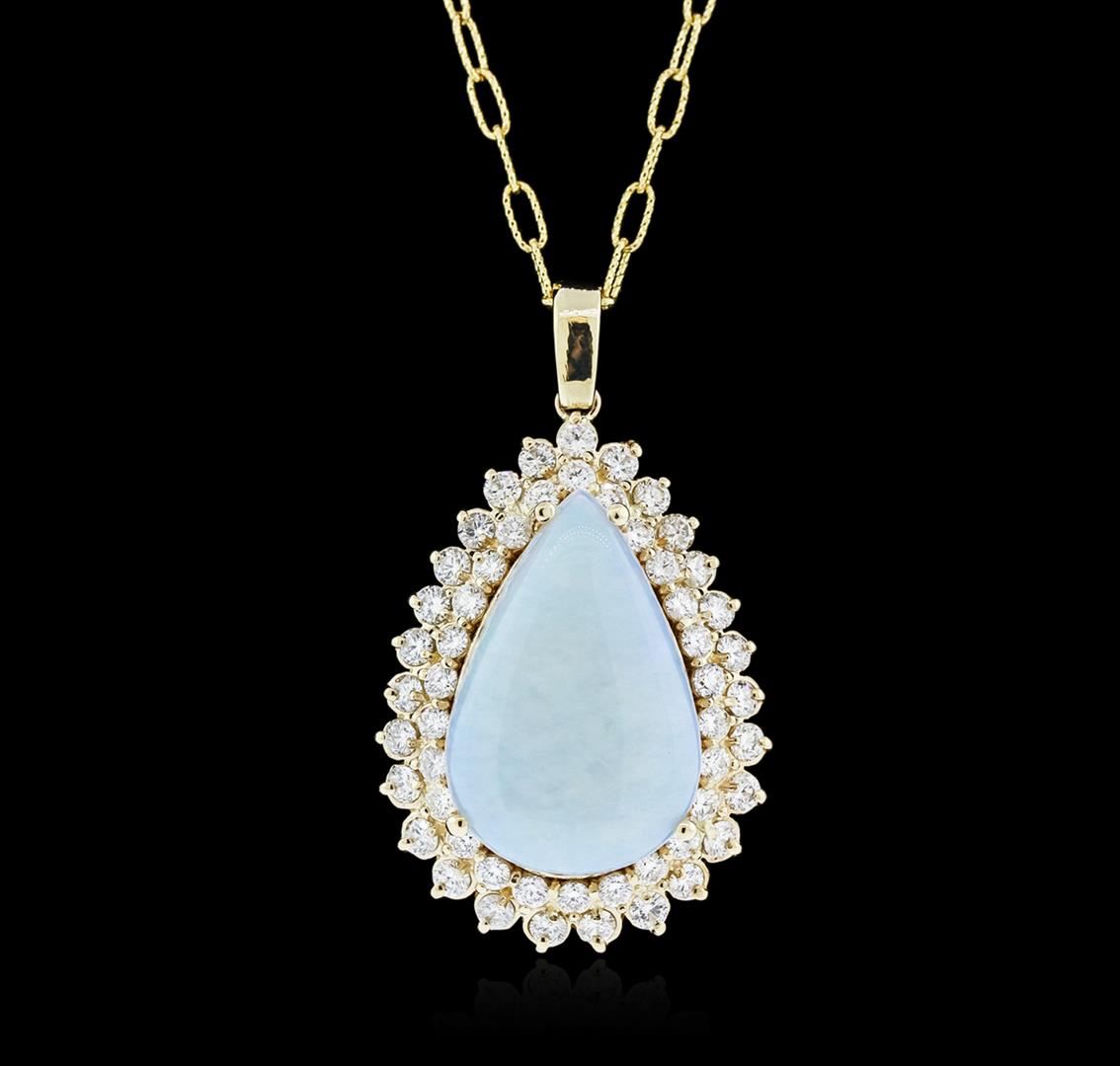 One electronically tested 14KT yellow gold ladies cast opal and diamond pendant & chain 18.0" long, with a lobster claw clasp with a bright polish finish. Identified with markings of "14K". Condition is new. Containing: One white opal that is cut in a pear shape and is prong set, measuring 25.49 mm long x 16.94 mm wide, and 8.00 mm thick and the approximate weight is 13.37 carats. The opal has a dull, blue-green play of color (fire) in a pattern; a medium dome; a good cut; no inclusions; consistent in its brightness and pattern; and is somewhat directional. Fifty-Three prong set round brilliant cut diamonds, measuring 2.50 - 2.20 x 1.41mm (depth est.) approximate total weight of 53 Stones = 2.52ct. Clarity: SI-1 to I-1. Color: I - K, Cut is Good. Colored gemstones are presumed to have been subjected to commonly used enhancement processes. All diamonds and colored gemstones are graded in the mounting, unless otherwise stated. Total Weight of Diamonds 2.52ct. Total Weight of Opals 13.37ct. Total Weight of Pendant & Chain 20.10 grams. GGL Appraised at $7,990.00.