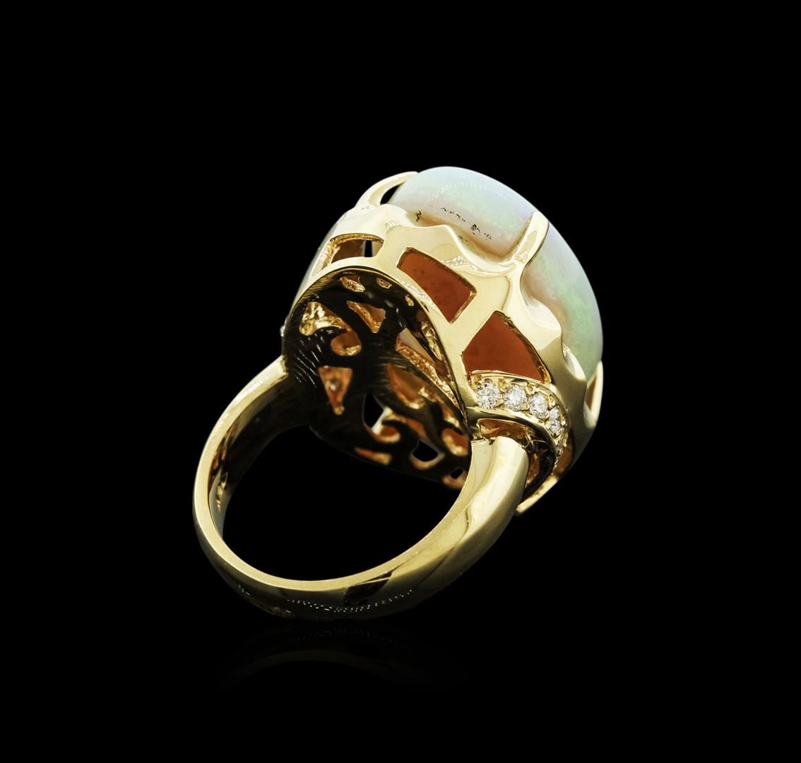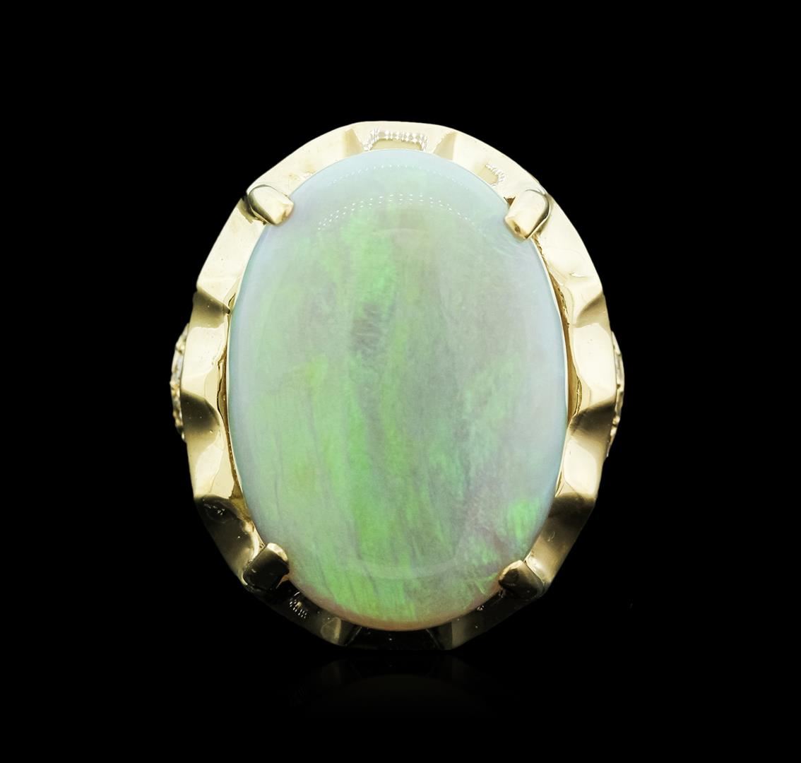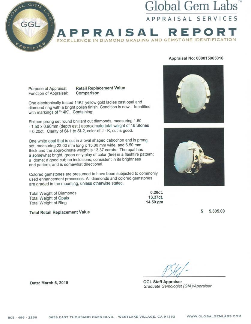 One electronically tested 14KT yellow gold ladies cast opal and diamond ring with a bright polish finish. Identified with markings of "14K". Condition is new. Containing: Sixteen prong set round brilliant cut diamonds, measuring 1.50 - 1.50 x 0.90mm (depth est.) approximate total weight of 16 Stones = 0.20ct.. Clarity: SI-1 to SI-2. Color: J - K, Cut is Good. One white opal that is cut in a oval shaped cabochon and is prong set, measuring 22.00 mm long x 15.00 mm wide, and 6.50 mm thick and the approximate weight is 13.37 carats. The opal has a somewhat bright, green only play of color (fire) in a flashfire pattern; a dome; a good cut; no inclusions; consistent in its brightness and pattern; and is somewhat directional. Colored gemstones are presumed to have been subjected to commonly used enhancement processes. All diamonds and colored gemstones are graded in the mounting, unless otherwise stated.. Total Weight of Diamonds 0.20ct.. Total Weight of Opals 13.37ct.. Total Weight of Ring 14.50 grams. GGL Appraised at $5,305.00.