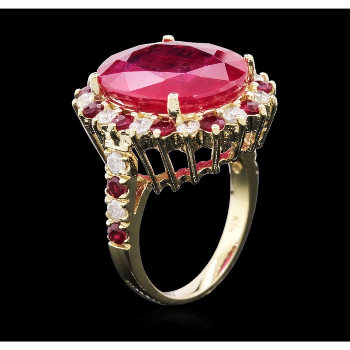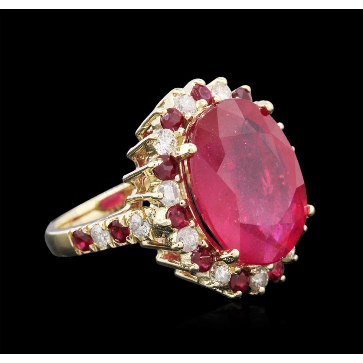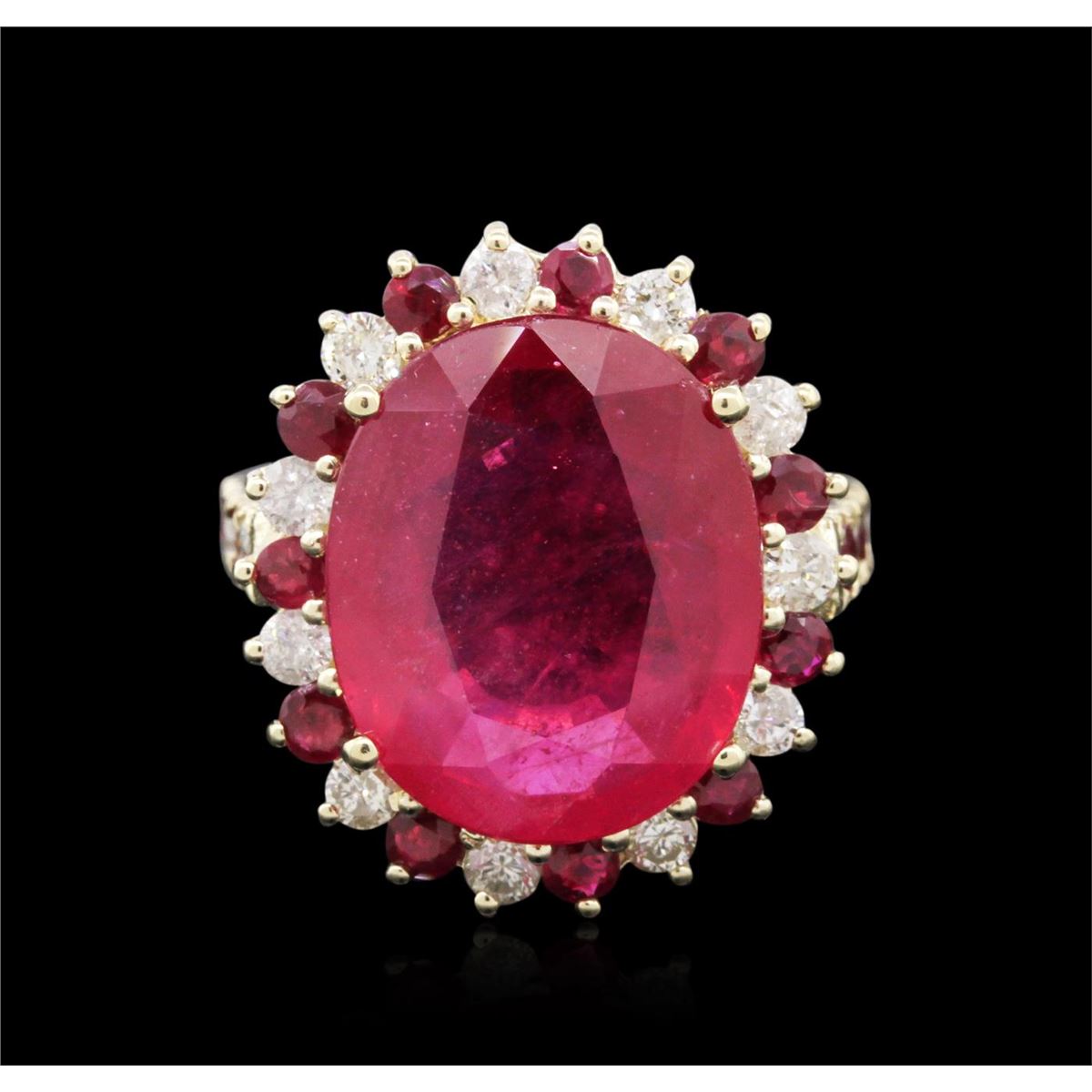 One electronically tested 14KT yellow gold ladies combination cast & assembled ruby and diamond ring with a cathedral shank with a bright polish finish. Identified with markings of "K14". Condition is new. Containing: One prong set oval modified brilliant cut natural ruby, measuring 16.69 x 13.69 x 6.40mm, approximate weight of 12.28ct., clarity is heavily included, type II, medium, moderately strong, strongly purplish red color, (GIA stpR 5/4), cut is good. Fifteen prong set round modified brilliant cut natural rubies, measuring 2.50 - 2.50 x 1.63 mm, approximate total weight of 1.20ct., clarity is moderately included, type II, medium dark, moderately strong, strongly purplish red color, (GIA stpR 6/4), cut is good. Eleven prong set round brilliant cut diamonds, measuring 2.20 - 2.20 x 1.32mm (depth est.) approximate total weight of 11 Stones = 0.43ct. Clarity: SI-1 to I-1. Color: I - J, Cut is Good. All diamonds and colored gemstones are graded in the mounting, unless otherwise stated. Colored gemstones are presumed to have been subjected to commonly used enhancement processes.. Total Weight of Colored Stones 13.48ct. Total Weight of Diamonds 0.43ct. Total Weight of Ring 10.00 grams. GGL Appraised at $4,855.00.