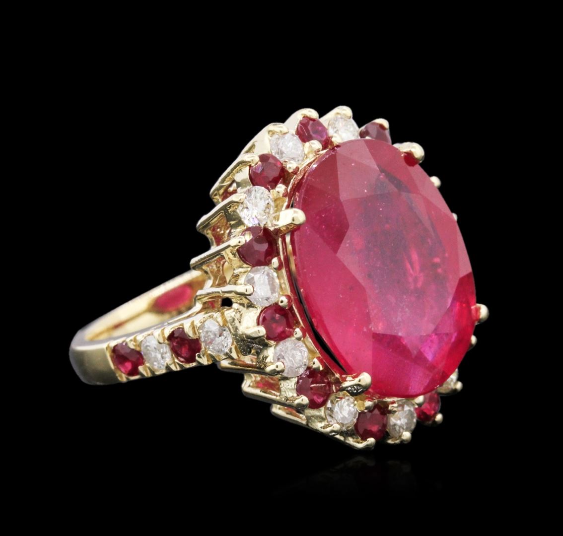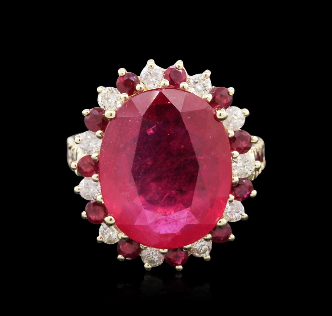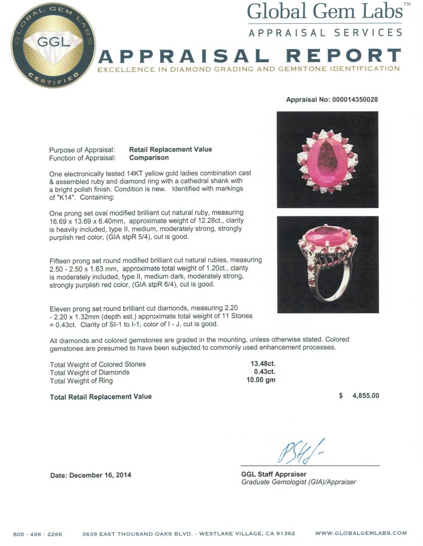 One electronically tested 14KT yellow gold ladies combination cast & assembled ruby and diamond ring with a cathedral shank with a bright polish finish. Identified with markings of "K14". Condition is new. Containing: One prong set oval modified brilliant cut natural ruby, measuring 16.69 x 13.69 x 6.40mm, approximate weight of 12.28ct., clarity is heavily included, type II, medium, moderately strong, strongly purplish red color, (GIA stpR 5/4), cut is good. Fifteen prong set round modified brilliant cut natural rubies, measuring 2.50 - 2.50 x 1.63 mm, approximate total weight of 1.20ct., clarity is moderately included, type II, medium dark, moderately strong, strongly purplish red color, (GIA stpR 6/4), cut is good. Eleven prong set round brilliant cut diamonds, measuring 2.20 - 2.20 x 1.32mm (depth est.) approximate total weight of 11 Stones = 0.43ct. Clarity: SI-1 to I-1. Color: I - J, Cut is Good. All diamonds and colored gemstones are graded in the mounting, unless otherwise stated. Colored gemstones are presumed to have been subjected to commonly used enhancement processes.. Total Weight of Colored Stones 13.48ct. Total Weight of Diamonds 0.43ct. Total Weight of Ring 10.00 grams. GGL Appraised at $4,855.00.