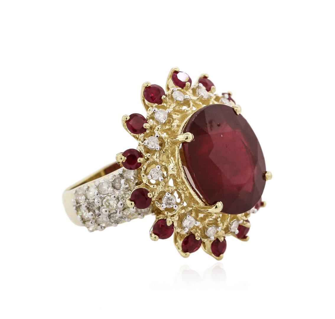 One electronically tested 14KT yellow gold ladies cast ruby and diamond ring. Condition is new, good workmanship. The featured ruby is set within an inner diamond bezel and an outer ruby bezel supported by diamond set shoulders, completed by a three millimeter wide band. Bright polish finish with rhodium accents. Identified with markings of K14. Containing: One prong set oval mixed cut natural ruby approximate weight of 12.15ct., clarity is heavily included, type II, dark, very slightly brownish, slightly purplish red color, (GIA slpR 7/3), cut is good. Transmitting light somewhat diffusely, transparent to translucent. Naturally occurring internal & external characteristics are present. Indications of laboratory high temperature heat treatment, with glass & flux additives. Graded in the setting. Ruby has a low tolerance to rhodium plating, repolishing the surface, & ultrasonic cleaning. Fourteen prong set round mixed cut natural rubies approximate total weight of 1.38ct., clarity is moderately included, type II, dark, very slightly brownish, slightly purplish red color, (GIA slpR 7/3), cut is good. Transmitting light somewhat diffusely, transparent to translucent. Natural occurring internal & external characteristics are present. Color grade is an average for the group. Graded in the setting. Forty-two prong set round brilliant cut diamonds, measuring 2.10 - 1.70 x 1.14mm (depth est.) approximate total weight of 42 Stones = 1.10ct. Graded in the setting. Clarity: I-1 to I-2. Color: H-J. Total Weight of Colored Stones: 13.53ct. Total Weight of Diamonds: 1.10ct. Total Weight of Ring: 12.21 grams. AIG Appraised at $6,550.00.
