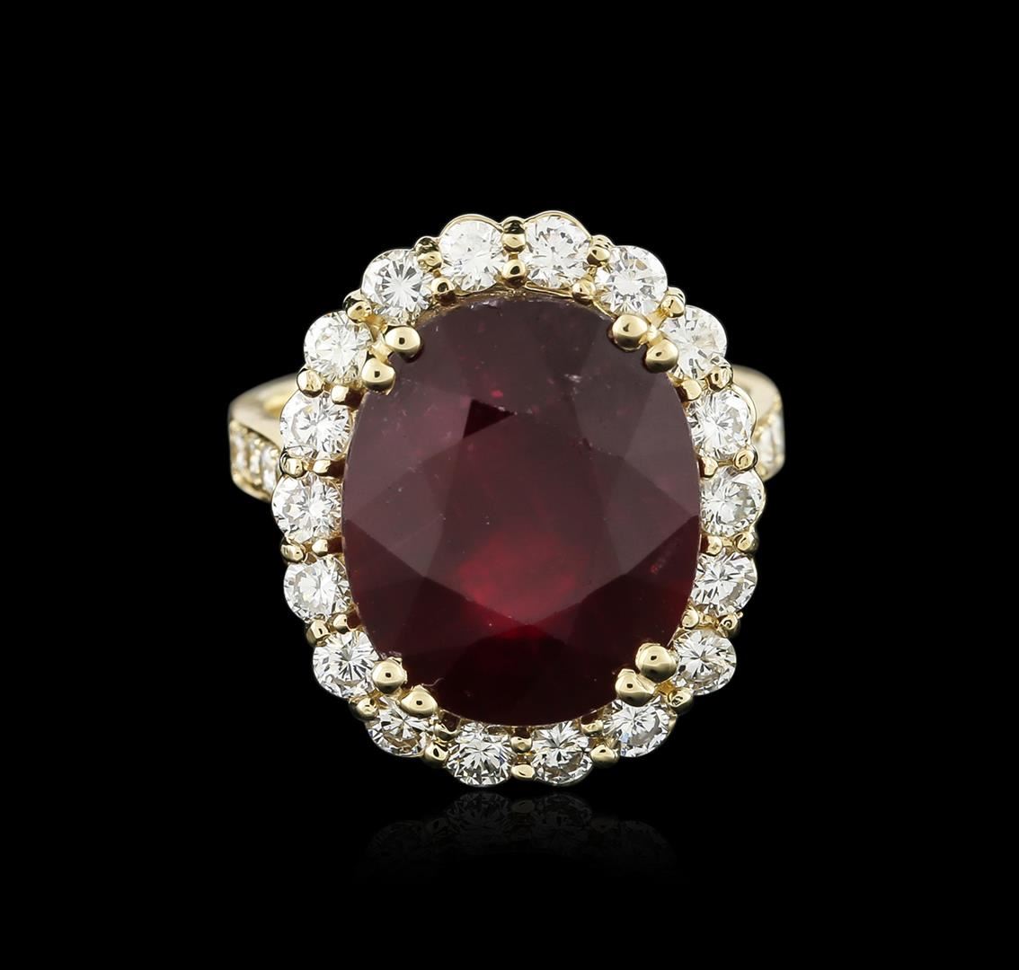 One electronically tested 14KT yellow gold ladies cast ruby and diamond ring with a cathedral shank with a bright polish finish. Identified with markings of "K14". Condition is new. Containing: One prong set oval modified brilliant cut natural ruby, measuring 15.21 x 12.60 x 8.43mm, approximate weight of 13.57ct., clarity is heavily included, type II, dark, very slightly brownish, strongly purplish red color, (GIA stpR 7/3), cut is good. Twenty-Eight prong set round brilliant cut diamonds, measuring 2.50 - 2.50 x 1.50mm (depth est.) approximate total weight of 28 Stones = 1.60ct. Clarity: VS-2 to SI-1. Color: J - K, Cut is Good. Diamonds and colored gemstones are graded in the mounting, unless otherwise stated. Colored gemstones are presumed to have been subjected to commonly used enhancement processes. Total Weight of Colored Stones 13.57ct. Total Weight of Diamonds 1.60ct. Total Weight of Ring 9.50 grams. GGL Appraised at $4,670.00.