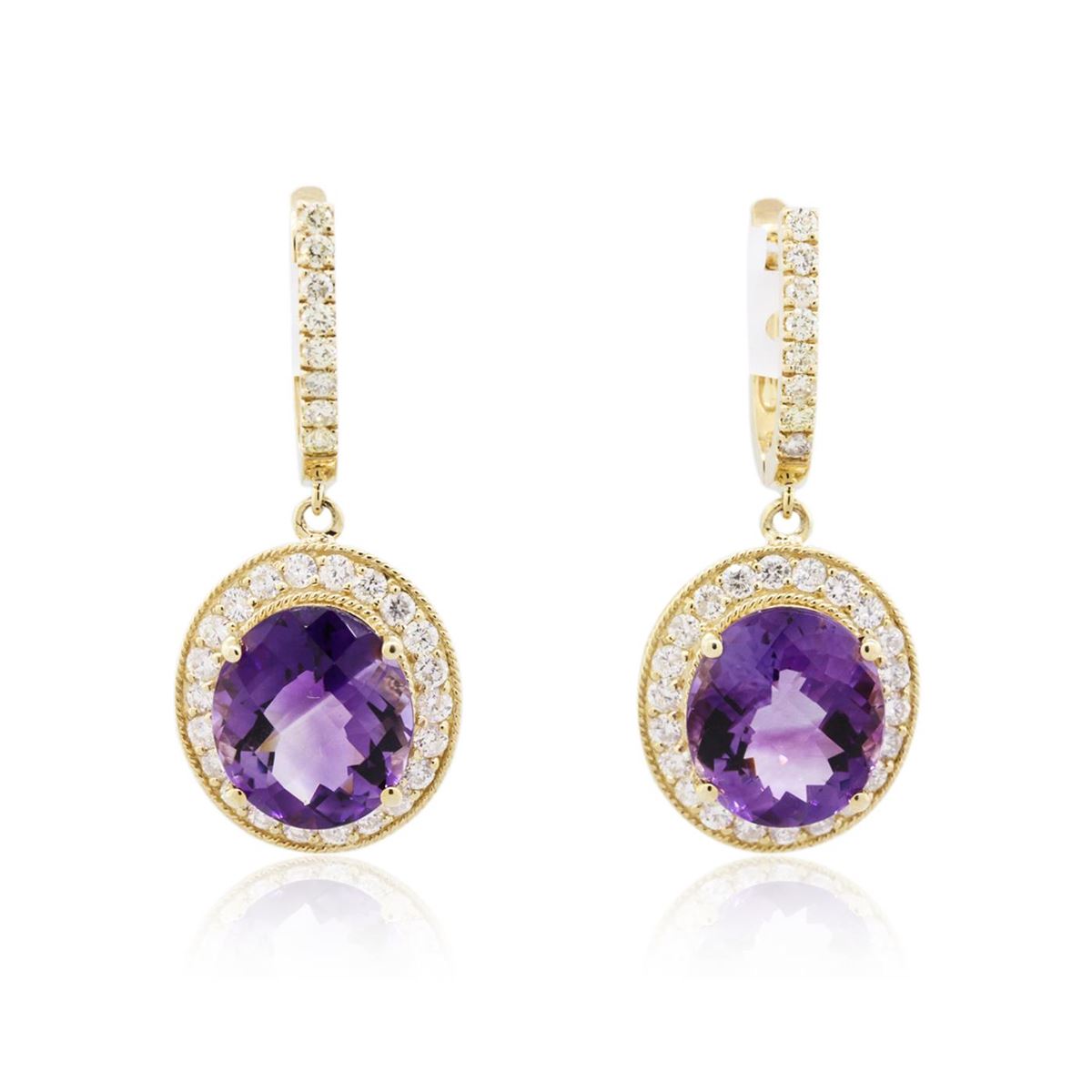 One pair electronically tested 14KT yellow gold ladies cast amethyst and diamond earrings with hinged clip backs with a bright polish finish. Identified with markings of "14K". Condition is new. Containing: Two prong set oval modified mixed cut natural amethysts, measuring 13.00 x 12.00 x 7.80mm, approximate total weight of 13.60ct., clarity is eye clean, type II, medium, moderately strong, purple color, (GIA P 5/4), cut is good. Sixty-Six prong set round brilliant cut diamonds, measuring 1.90 - 1.90 x 1.14mm (depth est.) approximate total weight of 66 Stones = 1.66ct. Clarity: I-1 to I-2. Color: I - J, Cut is Good. Colored gemstones are presumed to have been subjected to commonly used enhancement processes. All diamonds and colored gemstones are graded in the mounting, unless otherwise stated. Total Weight of Colored Stones 13.60ct. Total Weight of Diamonds 1.66ct. Total Weight of Earrings 12.00 grams. GGL Appraised at $6,685.00.