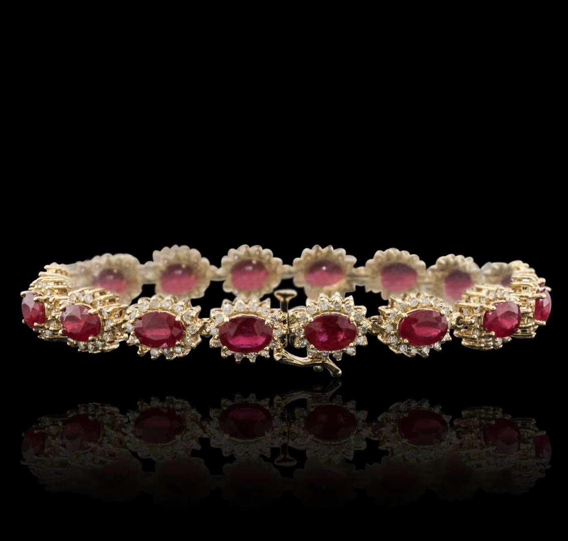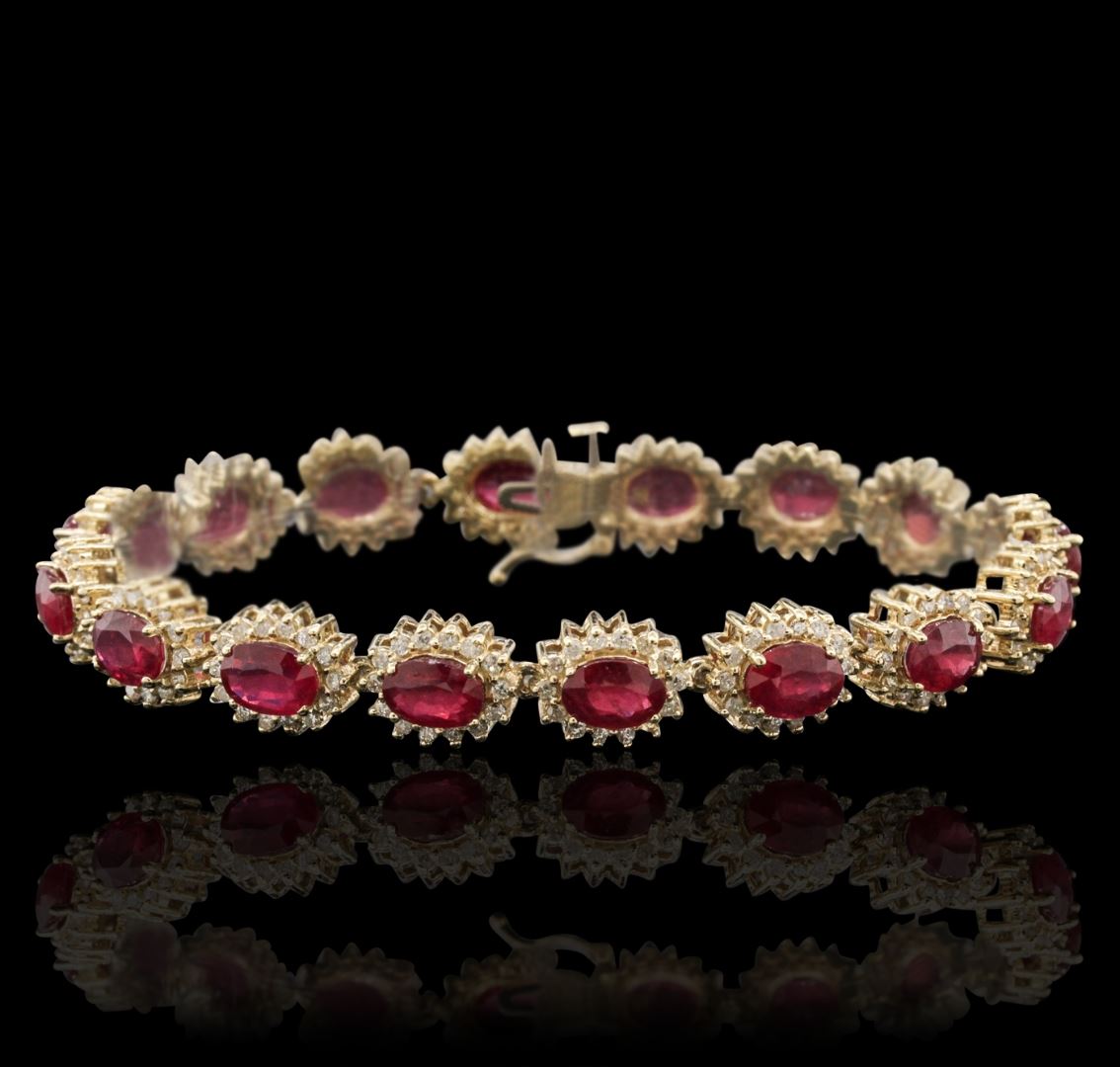 One electronically tested 14KT yellow gold ladies combination cast & assembled bracelet with a hidden box clasp with a bright polish finish. Condition is new. Measurements: 7" in length. Identified with markings of "14K". Containing: Sixteen prong set oval modified brilliant cut natural rubies, measuring 6.75 x 4.40 x 3.40mm, approximate. Total Weight of 13.60ct., clarity is heavily included, type II, medium dark, moderately strong, strongly purplish red color, (GIA stpR 6/4), cut is good. Two Hundred Twenty-Four prong set round brilliant cut diamonds, measuring 1.40 - 1.40 x 0.84mm (depth est.) approximate. Total Weight of 224 Stones = 2.24ct. Clarity: I-1 to I-2. Color: I - J, Cut is Good. Colored gemstones are presumed to have been subjected to commonly used enhancement processes. All diamonds and colored gemstones are graded in the mounting, unless otherwise stated. Total Weight of Colored Stones 13.60ct. Total Weight of Diamonds 2.24ct. Total Weight of Bracelet 22.10 grams. GGL Appraised at $14,800.00.