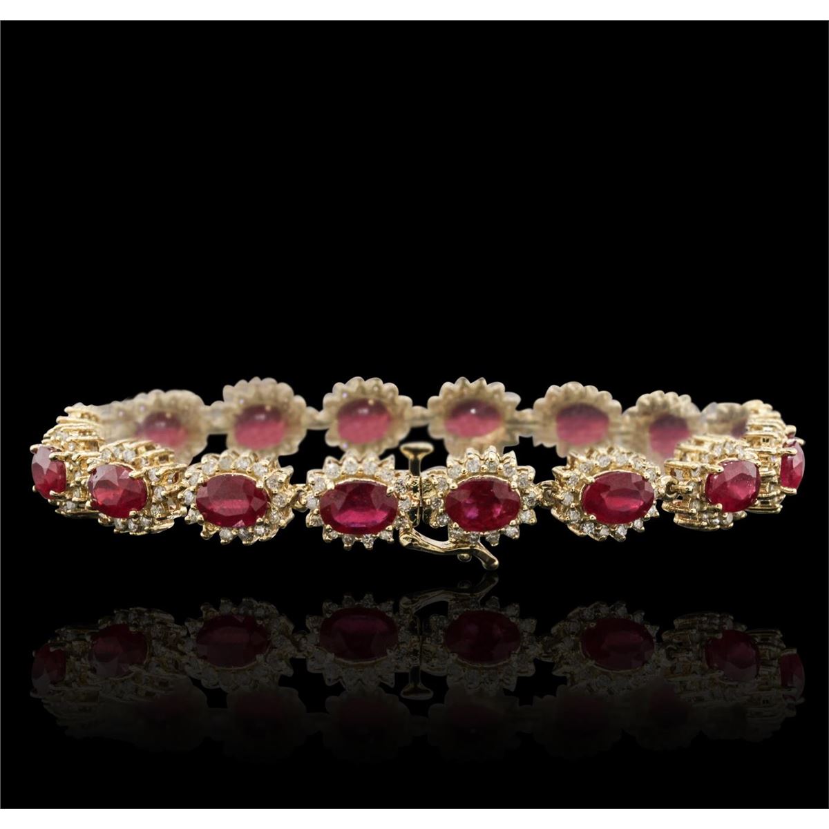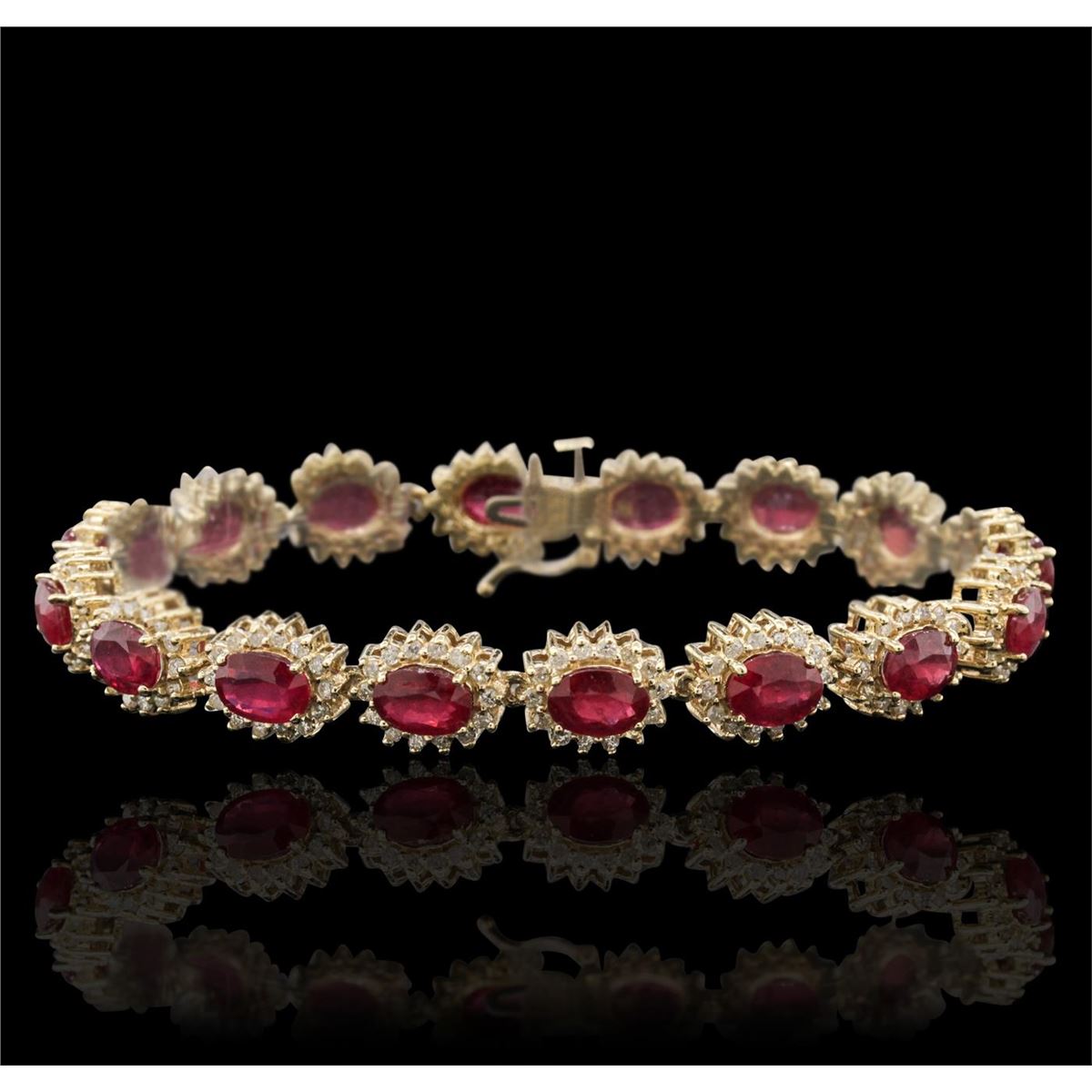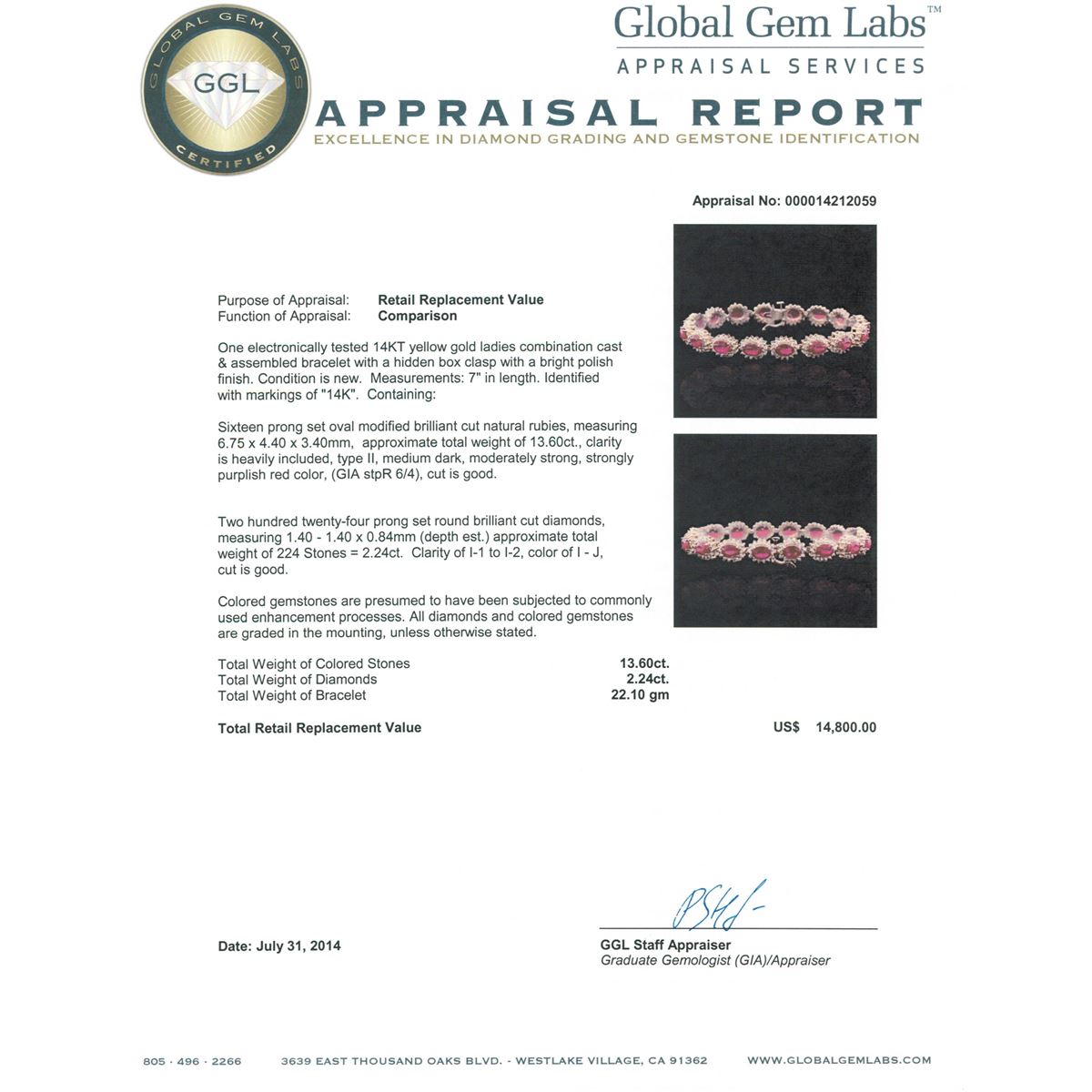 One electronically tested 14KT yellow gold ladies combination cast & assembled bracelet with a hidden box clasp with a bright polish finish. Condition is new. Measurements: 7" in length. Identified with markings of "14K". Containing: Sixteen prong set oval modified brilliant cut natural rubies, measuring 6.75 x 4.40 x 3.40mm, approximate. Total Weight of 13.60ct., clarity is heavily included, type II, medium dark, moderately strong, strongly purplish red color, (GIA stpR 6/4), cut is good. Two Hundred Twenty-Four prong set round brilliant cut diamonds, measuring 1.40 - 1.40 x 0.84mm (depth est.) approximate. Total Weight of 224 Stones = 2.24ct. Clarity: I-1 to I-2. Color: I - J, Cut is Good. Colored gemstones are presumed to have been subjected to commonly used enhancement processes. All diamonds and colored gemstones are graded in the mounting, unless otherwise stated. Total Weight of Colored Stones 13.60ct. Total Weight of Diamonds 2.24ct. Total Weight of Bracelet 22.10 grams. GGL Appraised at $14,800.00.
