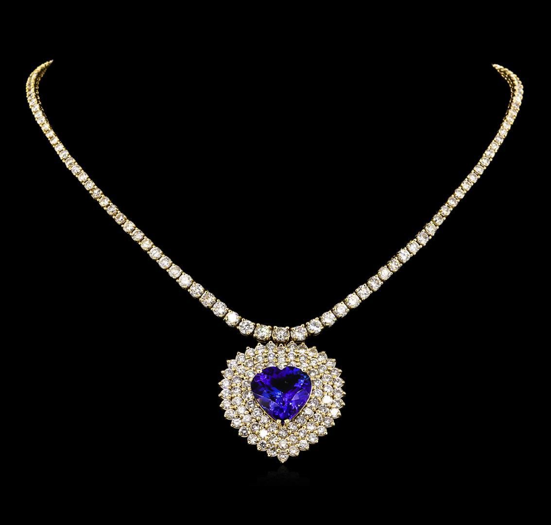 One electronically tested 14KT yellow gold Ladies combination cast & assembled necklace with a hidden box clasp with a bright polish finish. Condition is new. Measurements: 16" in length. Identified with markings of "14K". Containing: One prong set heart modified brilliant cut natural tanzanite, measuring 16.06 x 15.93 x 8.68mm, exact weight 13.62ct., clarity is eye clean, type I, medium, moderately strong, bluish violet color, (GIA bV 5/4), cut is very good. GIA Report: 1156961713. One Hundred Seventy-Nine prong set round brilliant cut diamonds, measuring 3.20 - 2.50 x 1.71mm (depth est.) approximate. Total Weight of 179 Stones = 15.16ct. Clarity: SI-2 to I-1. Color: J - K, Cut is Good. Twenty-Seven prong set round brilliant cut diamonds, measuring 4.50 - 3.50 x 2.40mm (depth est.) approximate. Total Weight of 27 Stones = 6.32ct. Clarity: SI-2 to I-1. Color: J - K, Cut is Good. Total Weight of Colored Stones 13.62ct. Total Weight of Diamonds 21.48ct. Total Weight of Necklace 38.90 grams. GGL Appraised.