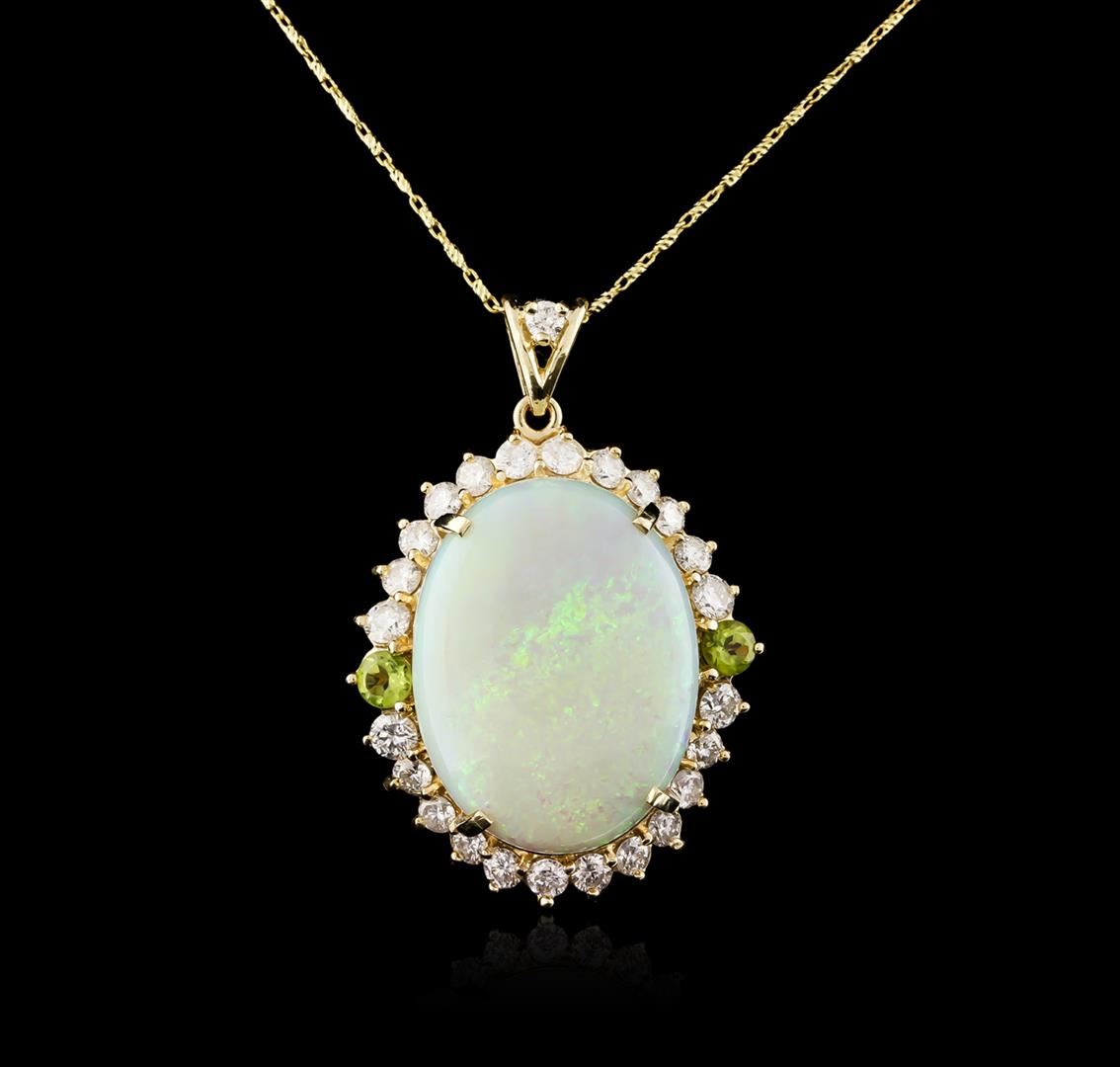 One electronically tested 14KT yellow gold ladies cast opal, peridot and diamond pendant & chain 18.0" long, with a lobster claw clasp with a bright polish finish. Identified with markings of "14K". Condition is new. Containing: One white opal that is cut in a oval shape and is prong set, measuring 25.00 mm long x 19.20 mm wide, and 6.50 mm thick and the approximate weight is 13.65 carats. The opal has a somewhat bright, green-blue play of color (fire) in a flashfire pattern; a medium dome; a good cut; no inclusions; consistent in its brightness and pattern; and is somewhat directional. Two prong set round modified brilliant cut natural peridots, measuring 4.20 - 4.20 x 2.73 mm, approximate total weight of 0.64ct., clarity is eye clean, type II, medium light, moderately strong, yellow green color, (GIA YG 4/4), cut is good. Twenty-Five prong set round brilliant cut diamonds, measuring 3.10 - 2.50 x 1.68mm (depth est.) approximate total weight of 25 Stones = 2.01ct. Clarity of SI-1 to I-1, Color of H - I, Cut is Good. Colored gemstones are presumed to have been subjected to commonly used enhancement processes. All diamonds and colored gemstones are graded in the mounting, unless otherwise stated. Total Weight of Colored Stones 0.64ct. Total Weight of Diamonds 2.01ct. Total Weight of Opals 13.65ct. Total Weight of Pendant & Chain 16.00 grams. GGL Appraised at $8,635.00.