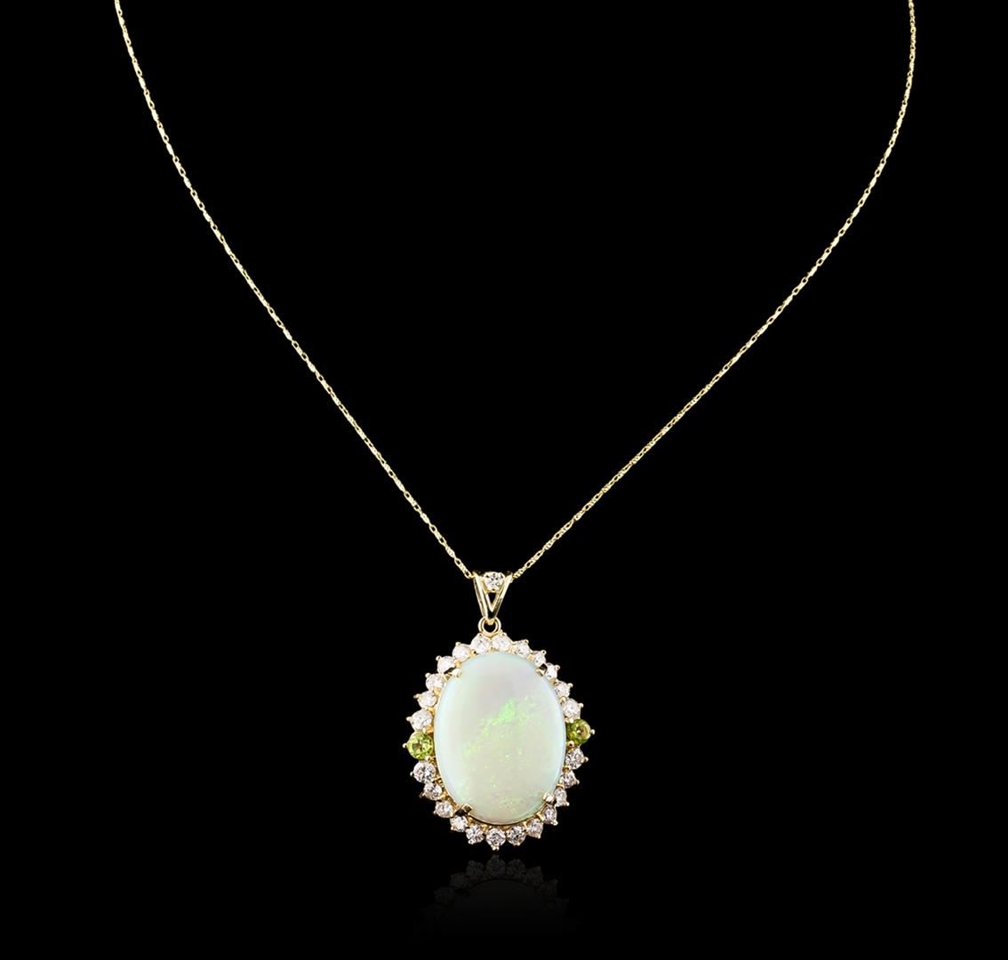 One electronically tested 14KT yellow gold ladies cast opal, peridot and diamond pendant & chain 18.0" long, with a lobster claw clasp with a bright polish finish. Identified with markings of "14K". Condition is new. Containing: One white opal that is cut in a oval shape and is prong set, measuring 25.00 mm long x 19.20 mm wide, and 6.50 mm thick and the approximate weight is 13.65 carats. The opal has a somewhat bright, green-blue play of color (fire) in a flashfire pattern; a medium dome; a good cut; no inclusions; consistent in its brightness and pattern; and is somewhat directional. Two prong set round modified brilliant cut natural peridots, measuring 4.20 - 4.20 x 2.73 mm, approximate total weight of 0.64ct., clarity is eye clean, type II, medium light, moderately strong, yellow green color, (GIA YG 4/4), cut is good. Twenty-Five prong set round brilliant cut diamonds, measuring 3.10 - 2.50 x 1.68mm (depth est.) approximate total weight of 25 Stones = 2.01ct. Clarity of SI-1 to I-1, Color of H - I, Cut is Good. Colored gemstones are presumed to have been subjected to commonly used enhancement processes. All diamonds and colored gemstones are graded in the mounting, unless otherwise stated. Total Weight of Colored Stones 0.64ct. Total Weight of Diamonds 2.01ct. Total Weight of Opals 13.65ct. Total Weight of Pendant & Chain 16.00 grams. GGL Appraised at $8,635.00.