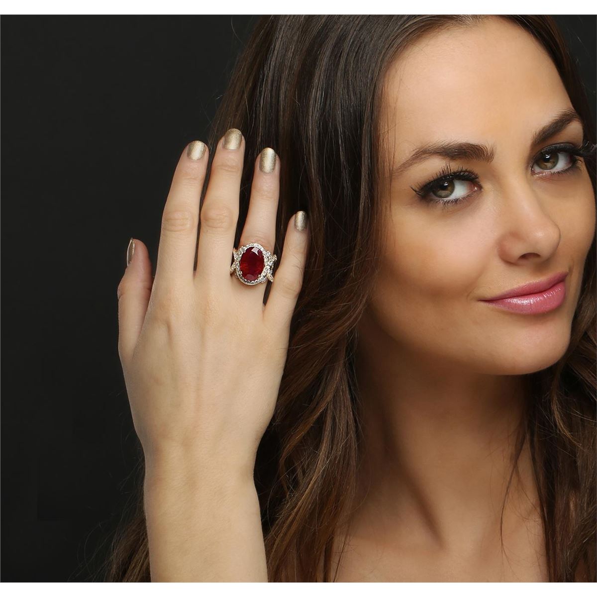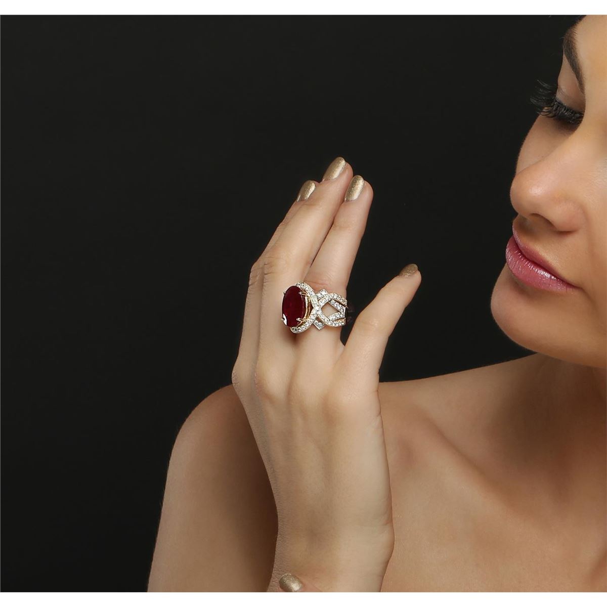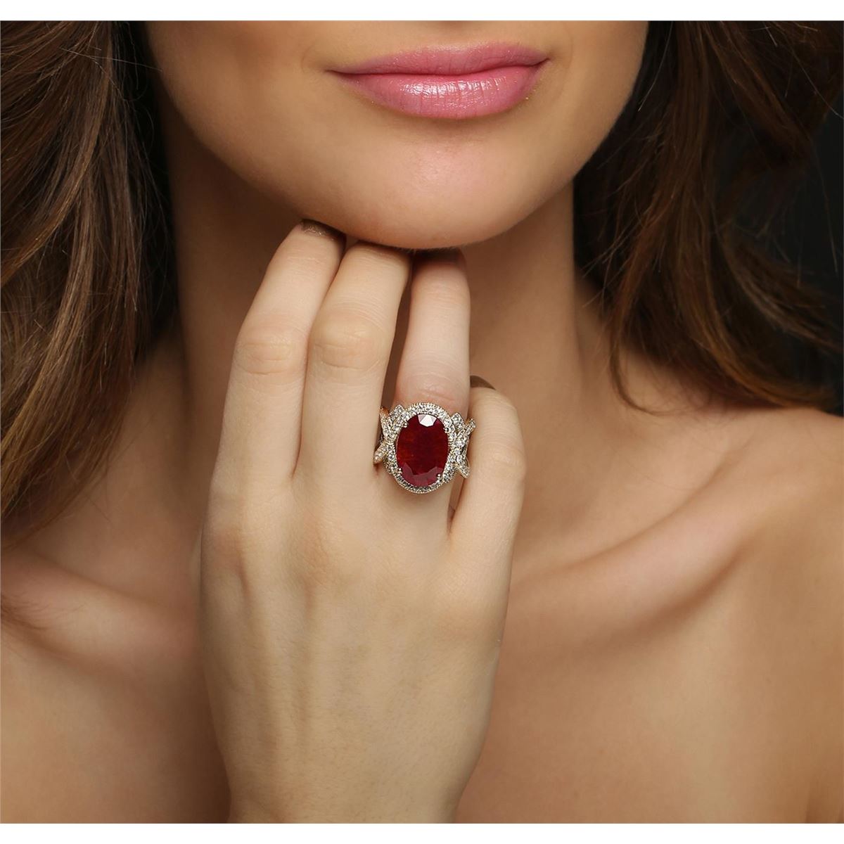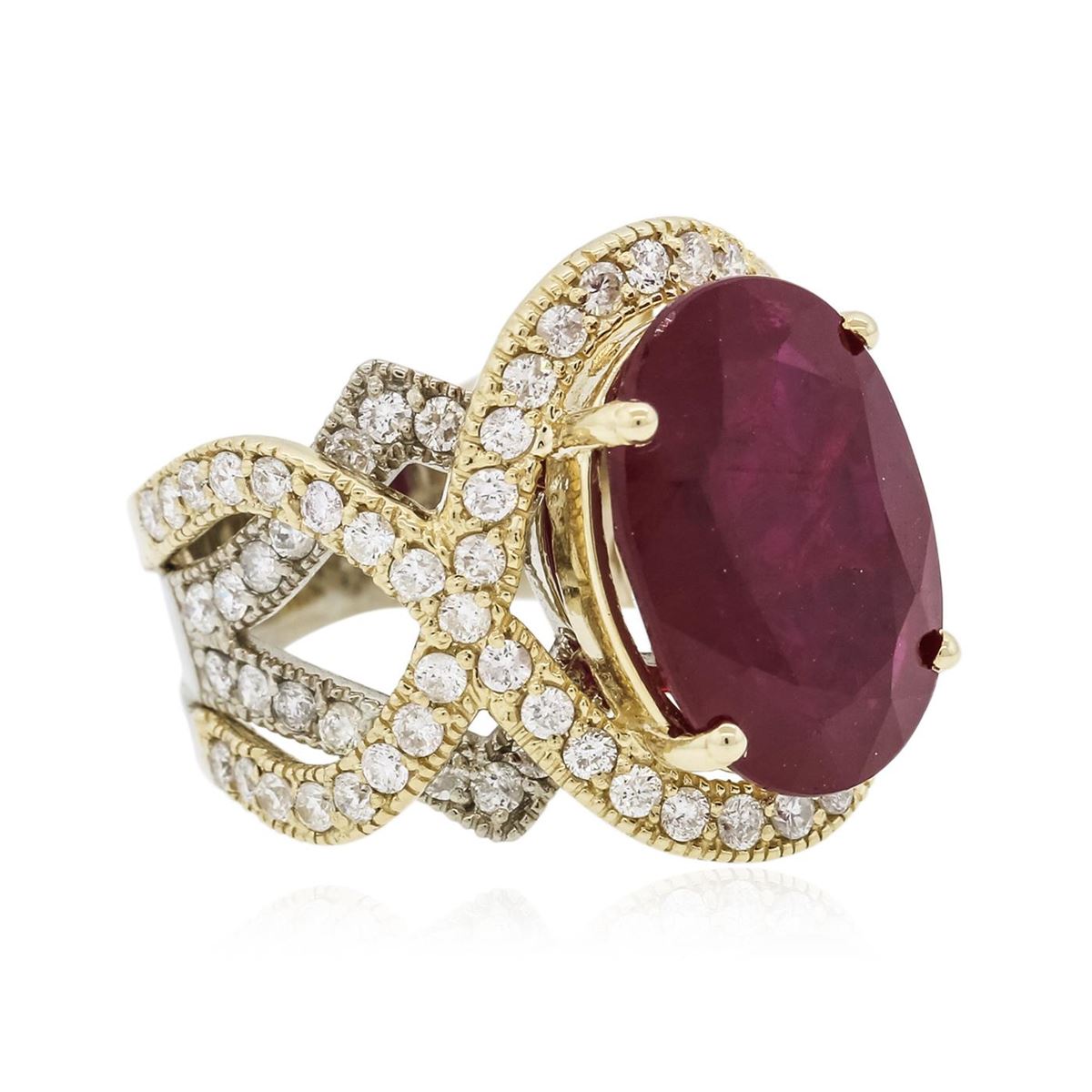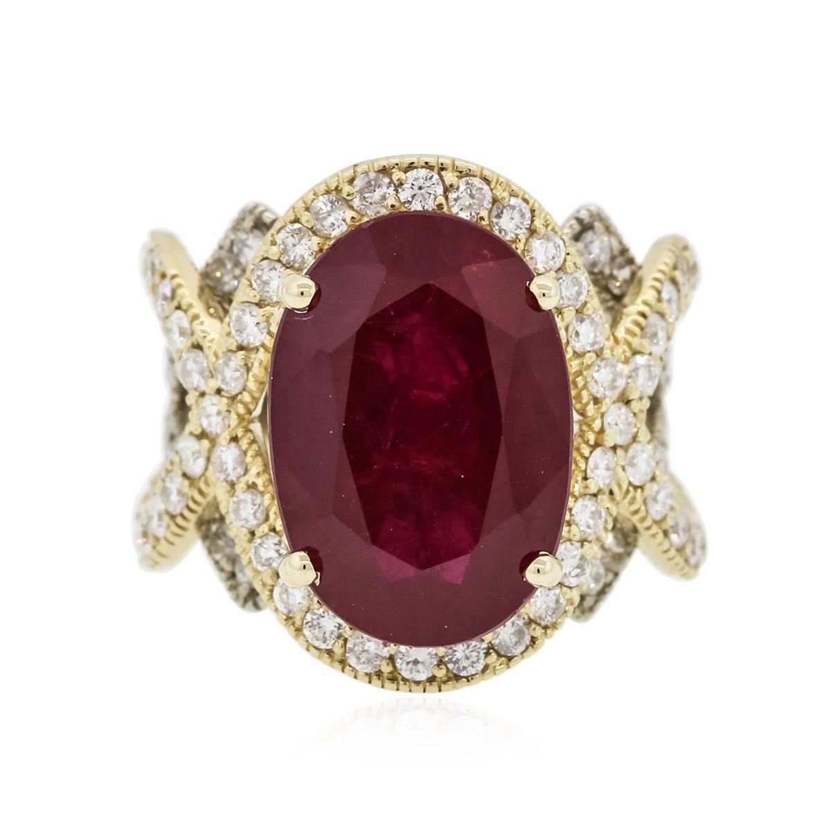 One electronically tested 14KT yellow gold ladies cast ruby and diamond ring. The featured ruby is set within a diamond bezel supported by intertwining diamond set shoulders, completed by a five and one-half millimeter wide band. Bright polish finish with milgrain detailing. Identified with markings of "14K". Condition is new, good workmanship. Containing: One prong set oval mixed cut natural ruby, measuring 17.50 x 12.40 x 7.10mm, 8% bulge factor, approximate weight of 13.71ct., clarity is heavily included, type II, medium dark, very slightly brownish, red color, (GIA R 6/3), cut is good. Transmitting light somewhat diffusely, transparent to translucent. Naturally occurring internal & external characteristics are present. Indications of laboratory high temperature heat treatment, with glass & flux additives. Graded in the setting. Ruby has a low tolerance to rhodium plating, repolishing the surface, & ultrasonic cleaning.Eighty-Eight prong set round brilliant cut diamonds, measuring 1.90 - 1.80 x 1.11mm (depth est.) approximate total weight of 88 Stones = 2.13ct. Graded in the setting. Clarity: SI-2 to I-2. Color: F - H. Total Weight of Colored Stones 13.71ct. Total Weight of Diamonds 2.13ct. Total Weight of Ring 15.03 grams. AIG Appraised at $11,095.00.
