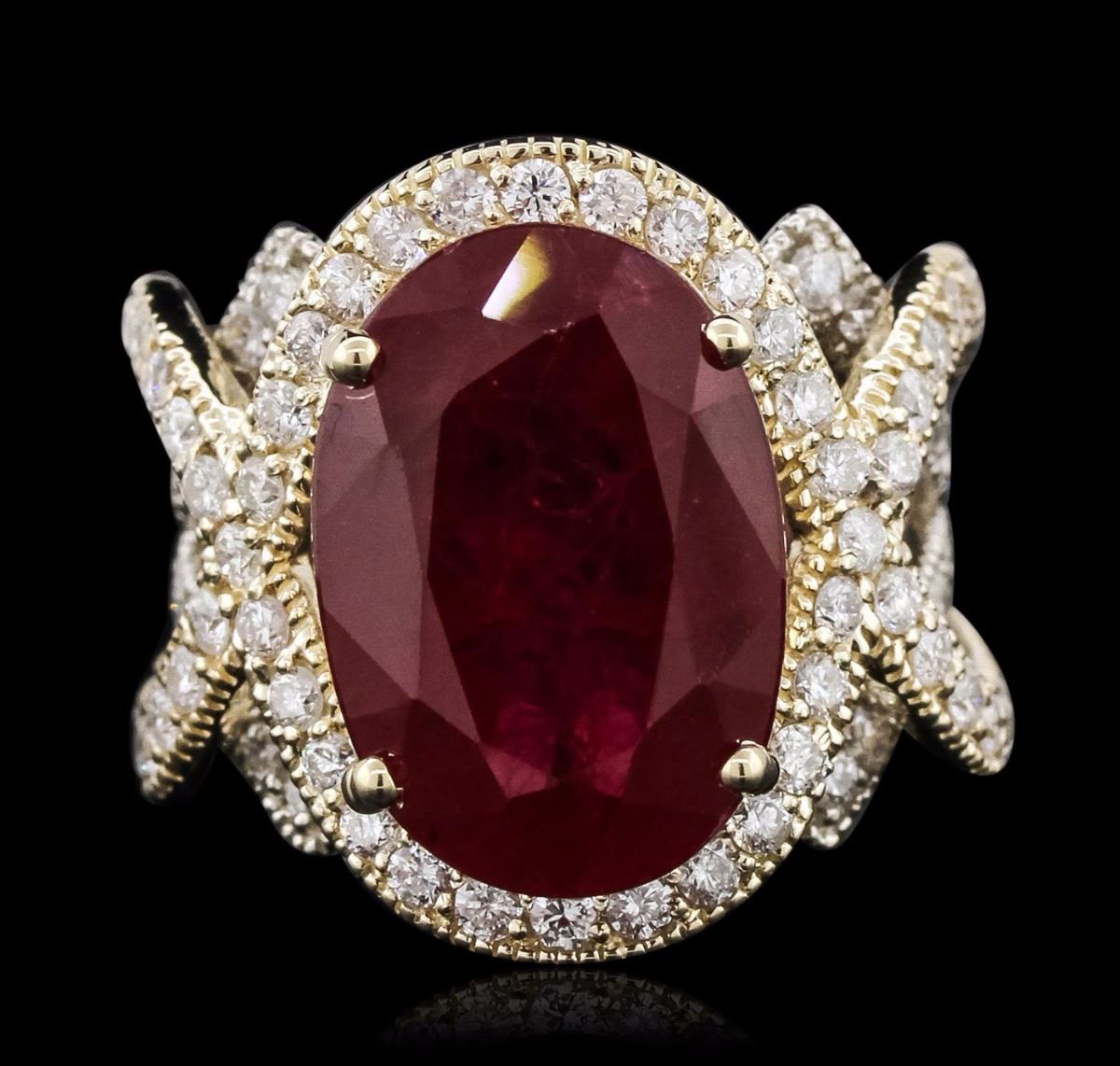 One electronically tested 14KT yellow gold ladies cast ruby and diamond ring. The featured ruby is set within a diamond bezel supported by intertwining diamond set shoulders, completed by a five and one-half millimeter wide band. Bright polish finish with milgrain detailing. Identified with markings of "14K". Condition is new, good workmanship. Containing: One prong set oval mixed cut natural ruby, measuring 17.50 x 12.40 x 7.10mm, 8% bulge factor, approximate weight of 13.71ct., clarity is heavily included, type II, medium dark, very slightly brownish, red color, (GIA R 6/3), cut is good. Transmitting light somewhat diffusely, transparent to translucent. Naturally occurring internal & external characteristics are present. Indications of laboratory high temperature heat treatment, with glass & flux additives. Graded in the setting. Ruby has a low tolerance to rhodium plating, repolishing the surface, & ultrasonic cleaning.Eighty-Eight prong set round brilliant cut diamonds, measuring 1.90 - 1.80 x 1.11mm (depth est.) approximate total weight of 88 Stones = 2.13ct. Graded in the setting. Clarity: SI-2 to I-2. Color: F - H. Total Weight of Colored Stones 13.71ct. Total Weight of Diamonds 2.13ct. Total Weight of Ring 15.03 grams. AIG Appraised at $11,095.00.