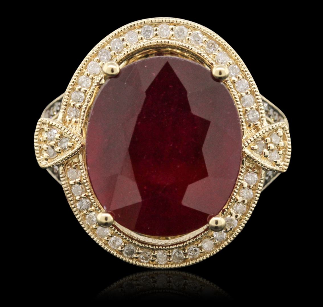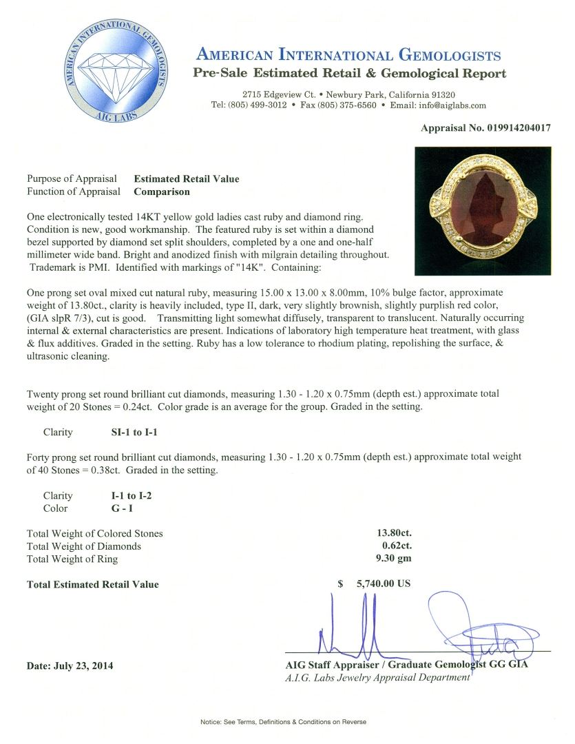 One electronically tested 14KT yellow gold ladies cast ruby and diamond ring. Condition is new, good workmanship. The featured ruby is set within a diamond bezel supported by diamond set split shoulders, completed by a one and one-half millimeter wide band. Bright and anodized finish with milgrain detailing throughout. Trademark is PMI. Identified with markings of "14K". Containing: One prong set oval mixed cut natural ruby, measuring 15.00 x 13.00 x 8.00mm, 10%. bulge factor, approximate weight of 13.80ct., clarity is heavily included, type II, dark, very slightly brownish, slightly purplish red color, (GIA slpR 7/3), cut is good. Transmitting light somewhat diffusely, transparent to translucent. Naturally occurring internal & external characteristics are present. Indications of laboratory high temperature heat treatment, with glass & flux additives. Graded in the setting. Ruby has a low tolerance to rhodium plating, repolishing the surface, & ultrasonic cleaning. Twenty prong set round brilliant cut diamonds, measuring 1.30 - 1.20 x 0.75mm (depth est.) approximate. Total Weight of 20 Stones = 0.24ct. Color grade is an average for the group. Graded in the setting. Clarity: SI-1 to I-1 Forty prong set round brilliant cut diamonds, measuring 1.30 - 1.20 x 0.75mm (depth est.) approximate. Total Weight of 40 Stones = 0.38ct. Graded in the setting. Clarity: I-1 to I-2. Color: G - I. Total Weight of Colored Stones 13.80ct. Total Weight of Diamonds 0.62ct. Total Weight of Ring 9.30 grams. AIG Appraised at $5,740.00.