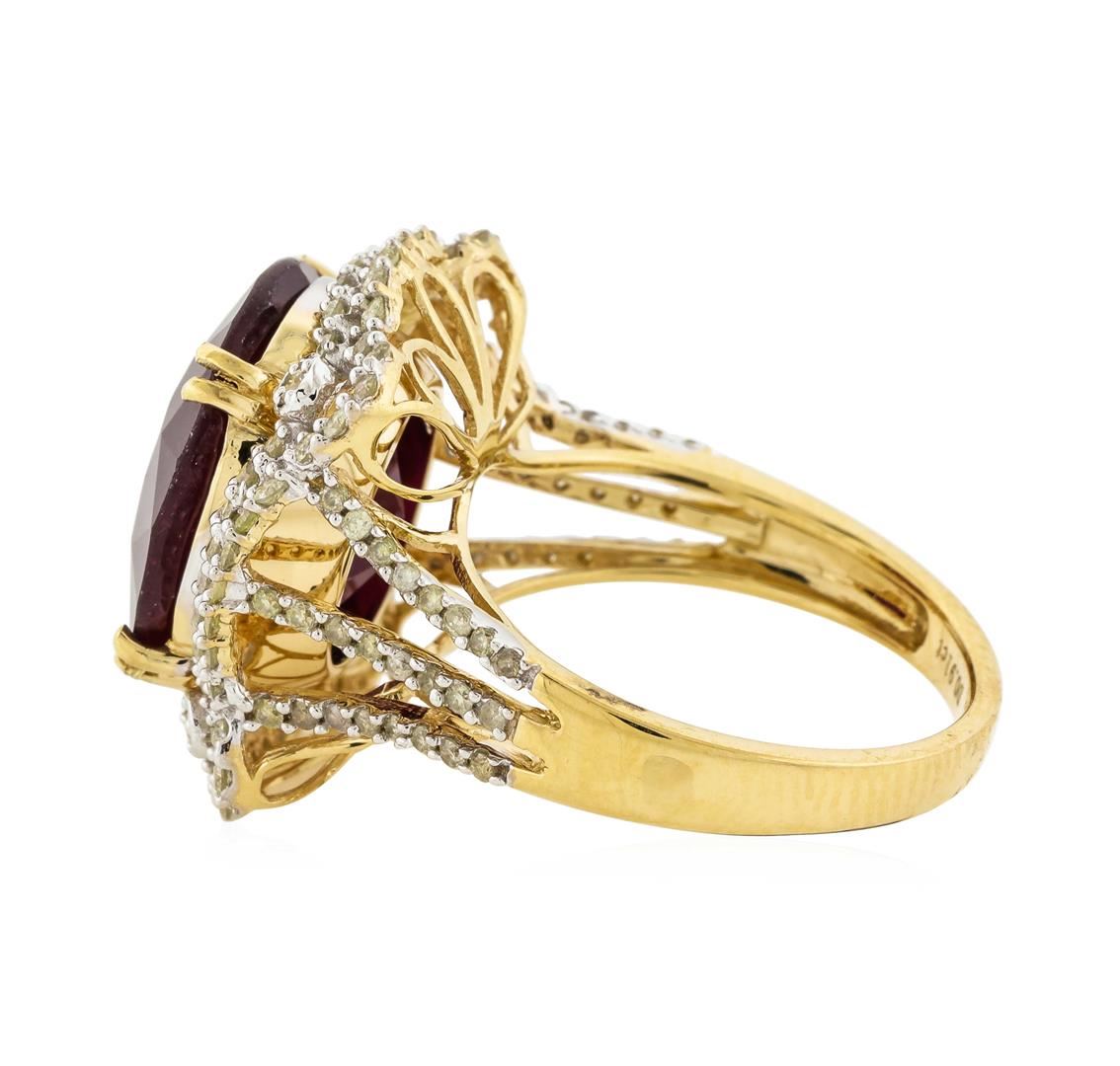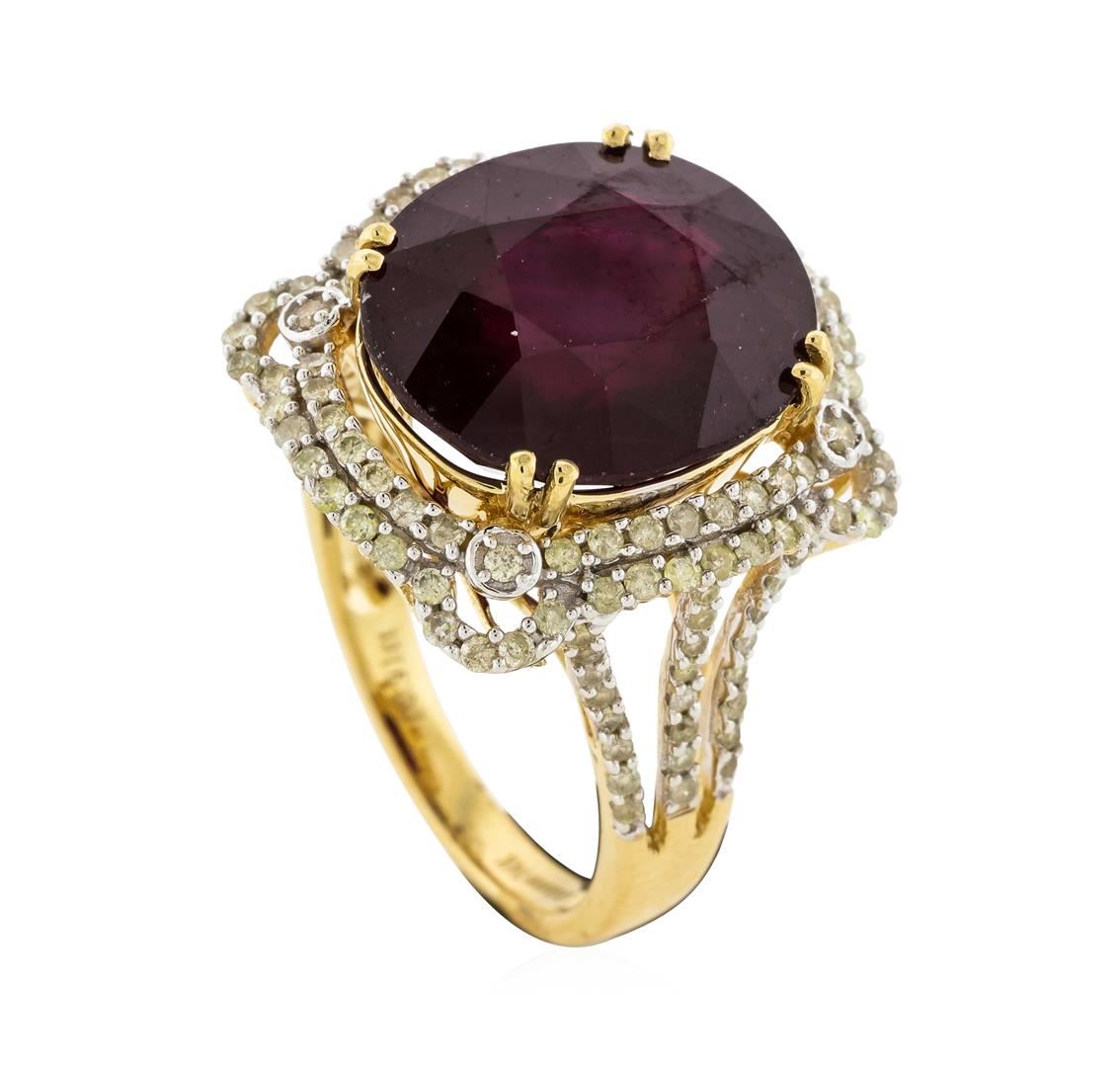One electronically tested 14KT yellow gold ladies cast ruby and diamond ring. The featured ruby is set within a stylized diamond bezel supported by a lattice under gallery and diamond set three-way split shoulders, completed by a two and one-half millimeter wide band. Bright polish finish with rhodium accents. Trademark is Orianne. Identified with markings of "14K". Condition is new, good workmanship. Containing: One prong set oval mixed cut natural ruby, measuring 15.20 x 13.15 x 8.40mm, approximate weight of 13.90ct., clarity is heavily included, type II, dark, very slightly brownish, slightly purplish red color, (GIA slpR 7/3), cut is good. Transmitting light somewhat diffusely, transparent to translucent. Naturally occurring internal & external characteristics are present. Indications of laboratory high temperature heat treatment, with glass & flux additives. Graded in the setting. Ruby has a low tolerance to rhodium plating, repolishing the surface, & ultrasonic cleaning. One Hundred Twenty-Eight prong set round brilliant cut diamonds approximate total weight of 128 Stones = 0.91ct. The color grade reflects the entire range of color for this group. Graded in the setting. Clarity: I-1 to I-3. Color: I - L. Total Weight of Colored Stones 13.90ct. Total Weight of Diamonds 0.91ct. Total Weight of Ring 8.96gm. AIG Appraised.