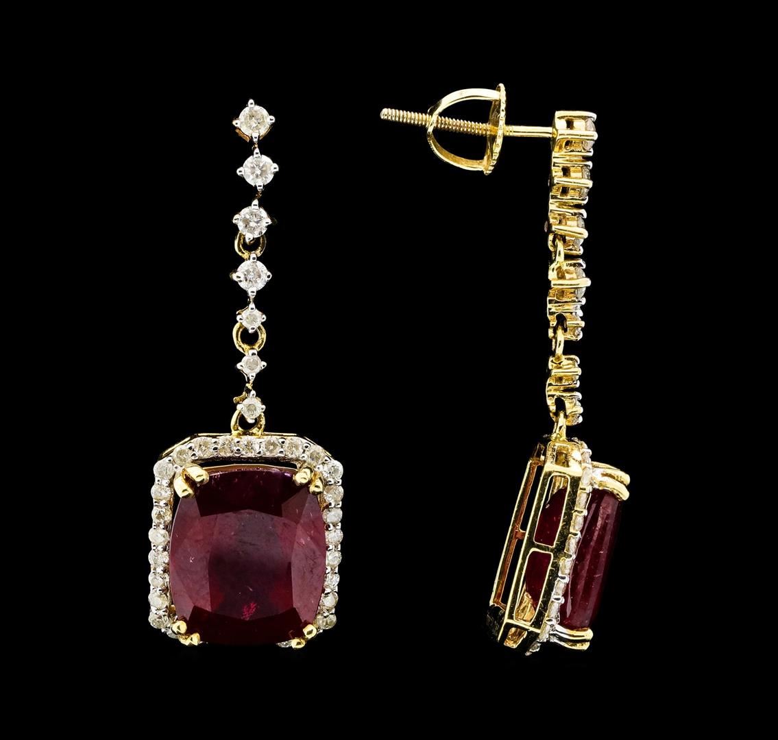 14KT white gold ruby and diamond drop earrings. TWO (2) radiant ruby corundum mounted in the center of the earrings. Round brilliant cut diamonds accent the earrings around the center gemstones and on the top clasps. The earrings are cast stamped "14K" and have a gross weight of 6.6 grams. Diamonds with a total weight of 0.98cts with a clarity of I1-I2 and color of H-J. 2 rubies with a total weight of 13.94cts. GA Appraised.