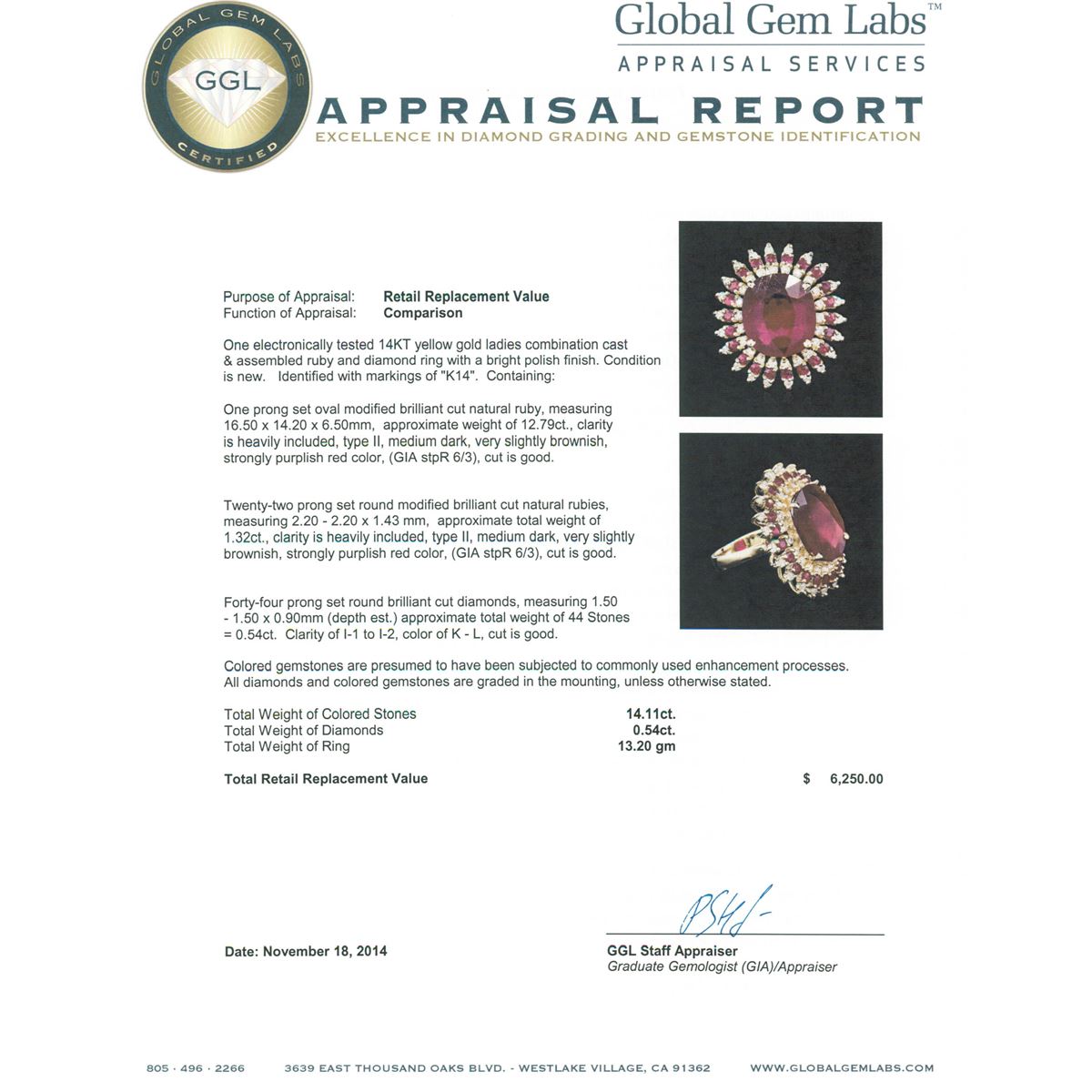 One electronically tested 14KT yellow gold ladies combination cast & assembled ruby and diamond ring with a bright polish finish. Identified with markings of "K14". Condition is new. Containing: One prong set oval modified brilliant cut natural ruby, measuring 16.50 x 14.20 x 6.50mm, approximate weight of 12.79ct., clarity is heavily included, type II, medium dark, very slightly brownish, strongly purplish red color, (GIA stpR 6/3), cut is good. Twenty-two prong set round modified brilliant cut natural rubies, measuring 2.20 - 2.20 x 1.43 mm, approximate total weight of 1.32ct., clarity is heavily included, type II, medium dark, very slightly brownish, strongly purplish red color, (GIA stpR 6/3), cut is good. Forty-Four prong set round brilliant cut diamonds, measuring 1.50 - 1.50 x 0.90mm (depth est.) approximate total weight of 44 Stones = 0.54ct. Clarity: I-1 to I-2. Color: K - L, Cut is Good. Colored gemstones are presumed to have been subjected to commonly used enhancement processes. All diamonds and colored gemstones are graded in the mounting, unless otherwise stated. Total Weight of Colored Stones 14.11ct. Total Weight of Diamonds 0.54ct. Total Weight of Ring 13.20 grams. GGL Appraised at $6,250.00.
