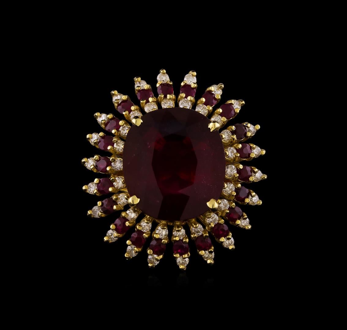 One electronically tested 14KT yellow gold ladies combination cast & assembled ruby and diamond ring with a bright polish finish. Identified with markings of "K14". Condition is new. Containing: One prong set oval modified brilliant cut natural ruby, measuring 16.50 x 14.20 x 6.50mm, approximate weight of 12.79ct., clarity is heavily included, type II, medium dark, very slightly brownish, strongly purplish red color, (GIA stpR 6/3), cut is good. Twenty-two prong set round modified brilliant cut natural rubies, measuring 2.20 - 2.20 x 1.43 mm, approximate total weight of 1.32ct., clarity is heavily included, type II, medium dark, very slightly brownish, strongly purplish red color, (GIA stpR 6/3), cut is good. Forty-Four prong set round brilliant cut diamonds, measuring 1.50 - 1.50 x 0.90mm (depth est.) approximate total weight of 44 Stones = 0.54ct. Clarity: I-1 to I-2. Color: K - L, Cut is Good. Colored gemstones are presumed to have been subjected to commonly used enhancement processes. All diamonds and colored gemstones are graded in the mounting, unless otherwise stated. Total Weight of Colored Stones 14.11ct. Total Weight of Diamonds 0.54ct. Total Weight of Ring 13.20 grams. GGL Appraised at $6,250.00.