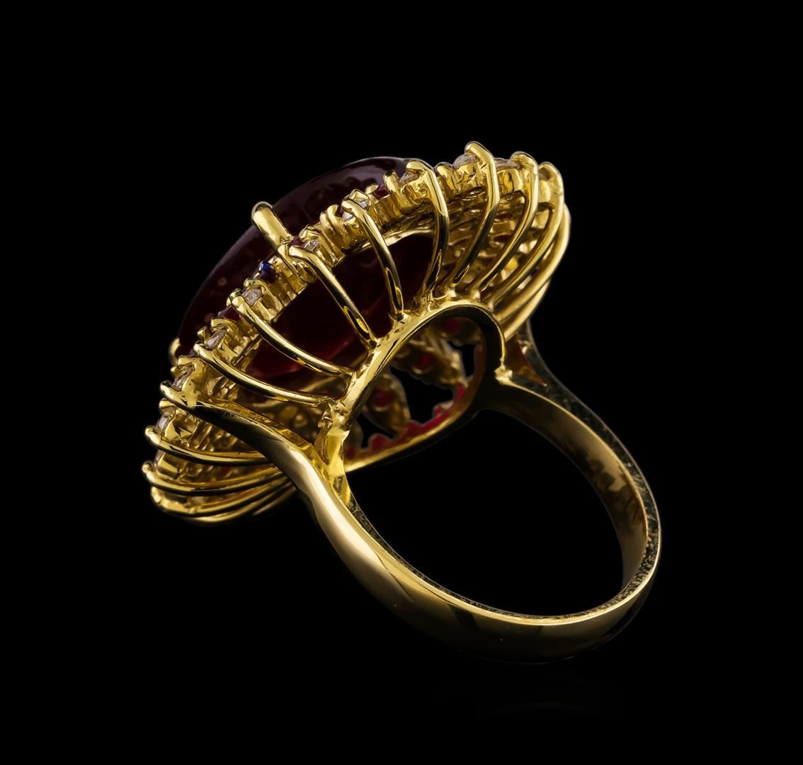 One electronically tested 14KT yellow gold ladies combination cast & assembled ruby and diamond ring with a bright polish finish. Identified with markings of "K14". Condition is new. Containing: One prong set oval modified brilliant cut natural ruby, measuring 16.50 x 14.20 x 6.50mm, approximate weight of 12.79ct., clarity is heavily included, type II, medium dark, very slightly brownish, strongly purplish red color, (GIA stpR 6/3), cut is good. Twenty-two prong set round modified brilliant cut natural rubies, measuring 2.20 - 2.20 x 1.43 mm, approximate total weight of 1.32ct., clarity is heavily included, type II, medium dark, very slightly brownish, strongly purplish red color, (GIA stpR 6/3), cut is good. Forty-Four prong set round brilliant cut diamonds, measuring 1.50 - 1.50 x 0.90mm (depth est.) approximate total weight of 44 Stones = 0.54ct. Clarity: I-1 to I-2. Color: K - L, Cut is Good. Colored gemstones are presumed to have been subjected to commonly used enhancement processes. All diamonds and colored gemstones are graded in the mounting, unless otherwise stated. Total Weight of Colored Stones 14.11ct. Total Weight of Diamonds 0.54ct. Total Weight of Ring 13.20 grams. GGL Appraised at $6,250.00.