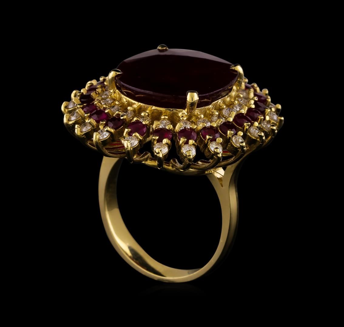 One electronically tested 14KT yellow gold ladies combination cast & assembled ruby and diamond ring with a bright polish finish. Identified with markings of "K14". Condition is new. Containing: One prong set oval modified brilliant cut natural ruby, measuring 16.50 x 14.20 x 6.50mm, approximate weight of 12.79ct., clarity is heavily included, type II, medium dark, very slightly brownish, strongly purplish red color, (GIA stpR 6/3), cut is good. Twenty-two prong set round modified brilliant cut natural rubies, measuring 2.20 - 2.20 x 1.43 mm, approximate total weight of 1.32ct., clarity is heavily included, type II, medium dark, very slightly brownish, strongly purplish red color, (GIA stpR 6/3), cut is good. Forty-Four prong set round brilliant cut diamonds, measuring 1.50 - 1.50 x 0.90mm (depth est.) approximate total weight of 44 Stones = 0.54ct. Clarity: I-1 to I-2. Color: K - L, Cut is Good. Colored gemstones are presumed to have been subjected to commonly used enhancement processes. All diamonds and colored gemstones are graded in the mounting, unless otherwise stated. Total Weight of Colored Stones 14.11ct. Total Weight of Diamonds 0.54ct. Total Weight of Ring 13.20 grams. GGL Appraised at $6,250.00.