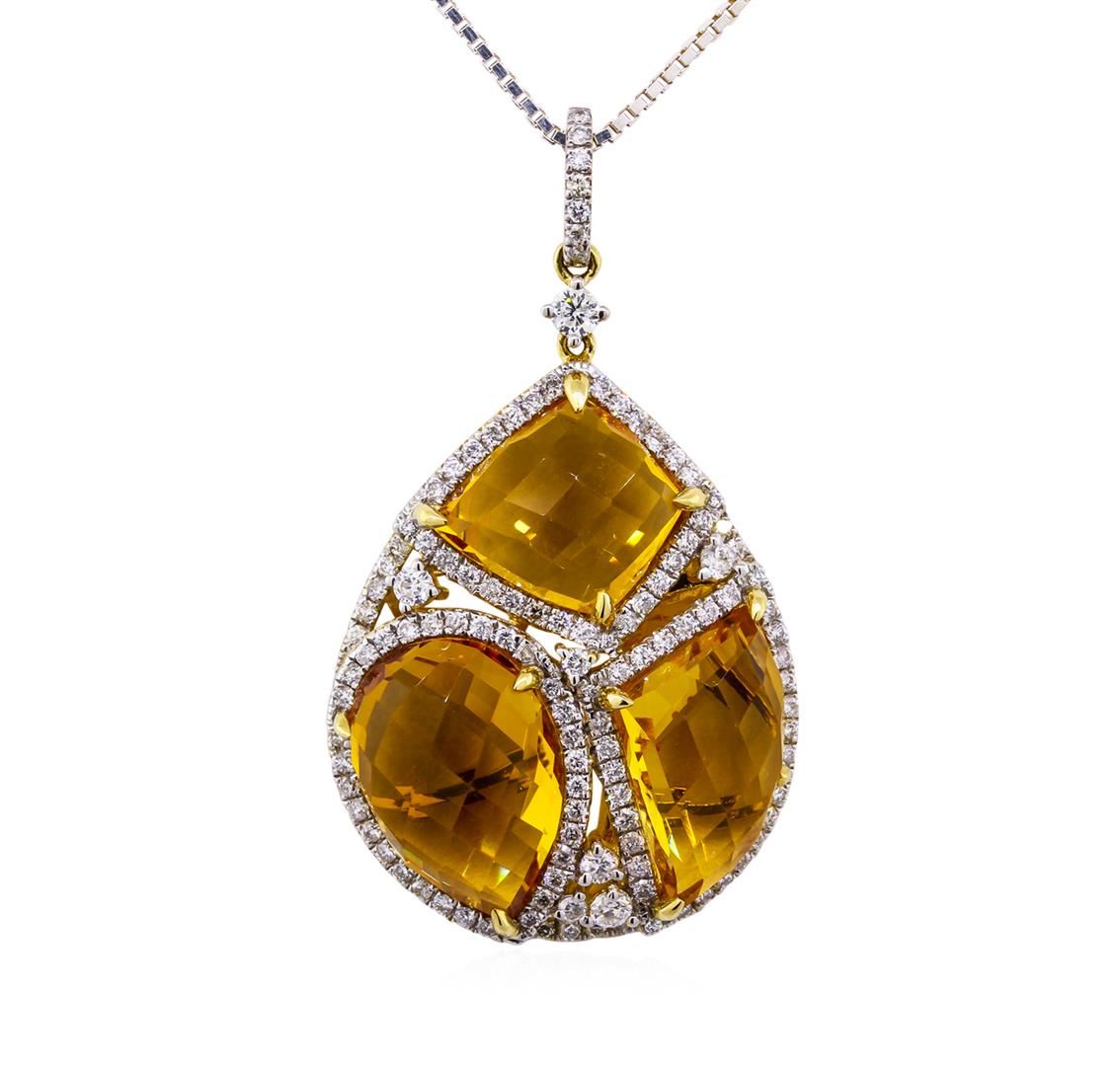 One citrine and diamond pendant with chain necklace set in 6.00 grams of 14KT yellow Gold. This gorgeous necklace features three citrine gemstones with a total weight of 14.16 intricately showcased by one hundred and eighteen round diamonds weighing 0.98 carats.