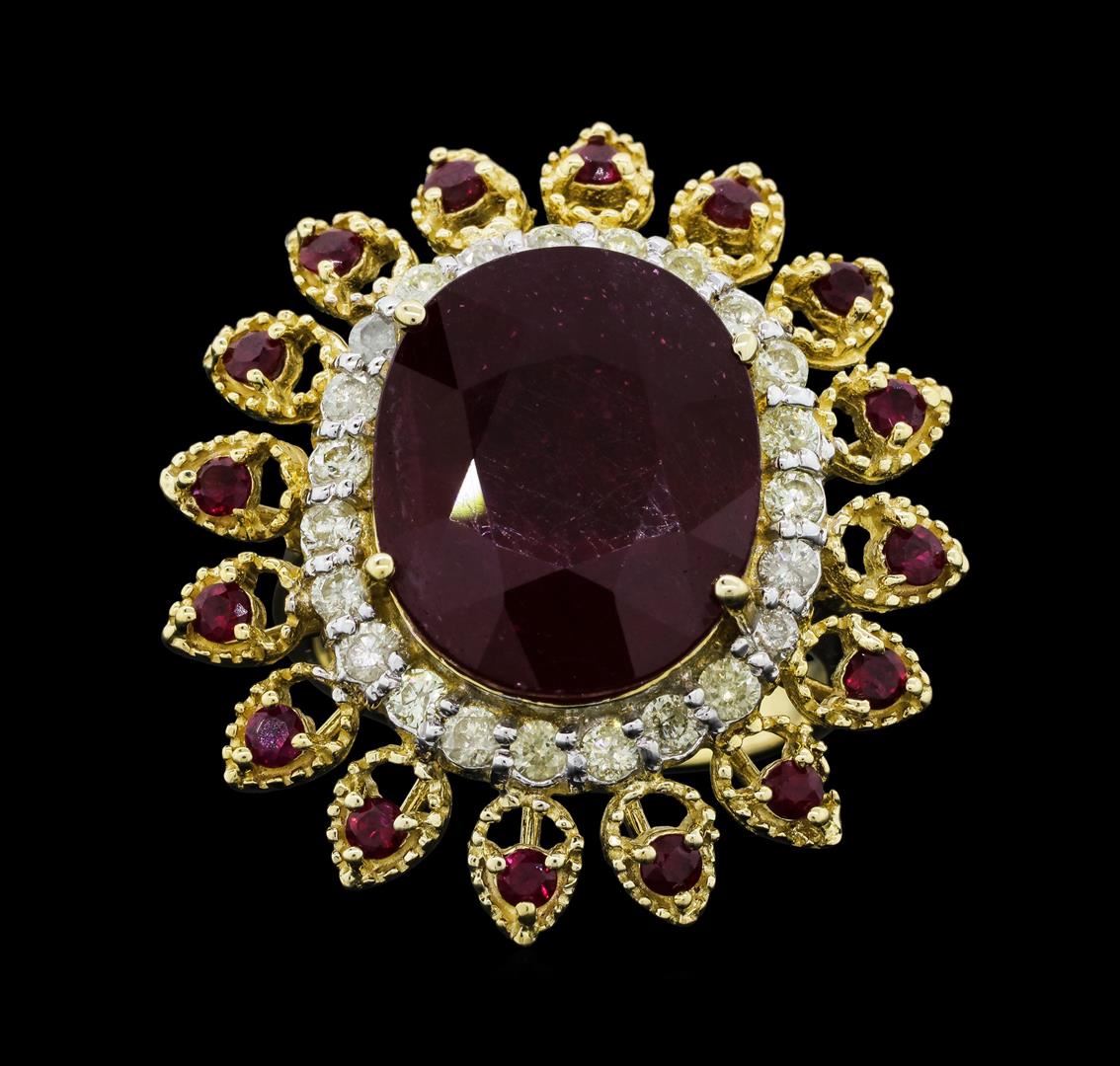 One electronically tested 14KT yellow gold ladies cast ruby and diamond ring. The featured ruby is set within a stylized diamond and ruby floret, completed by a three millimeter wide band. Bright polish finish with rhodium accents. Identified with markings of "K14". Condition is new, good workmanship. Containing: One prong set oval mixed cut natural ruby, measuring 15.20 x 12.50 x 7.50mm, approximate weight of 13.61ct., clarity is heavily included, type II, medium dark, very slightly brownish, slightly purplish red color, (GIA slpR 6/3), cut is good. Transmitting light somewhat diffusely, transparent to translucent. Naturally occurring internal & external characteristics are present. Indications of laboratory high temperature heat treatment, with glass & flux additives. Graded in the setting. Ruby has a low tolerance to rhodium plating, repolishing the surface, & ultrasonic cleaning.Sixteen prong set round mixed cut natural rubies, measuring 2.00 - 2.00 x 1.30 mm, approximate total weight of 0.64ct., clarity is moderately included, type II, medium dark, very slightly brownish, slightly purplish red color, (GIA slpR 6/3), cut is good. Transmitting light with a minimum of distortion, transparent. Naturally occurring internal & external characteristics are present. Measurements & the color grade are an average for the group. Graded in the setting.Twenty-Three prong set round brilliant cut diamonds approximate total weight of 23 Stones = 0.73ct. The color grade reflects the entire range of color for this group. Graded in the setting. Clarity: I-2 to I-3. Color: I - L. Total Weight of Colored Stones 14.25ct. Total Weight of Diamonds 0.73ct. Total Weight of Ring 10.95gm. AIG Appraised.
