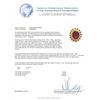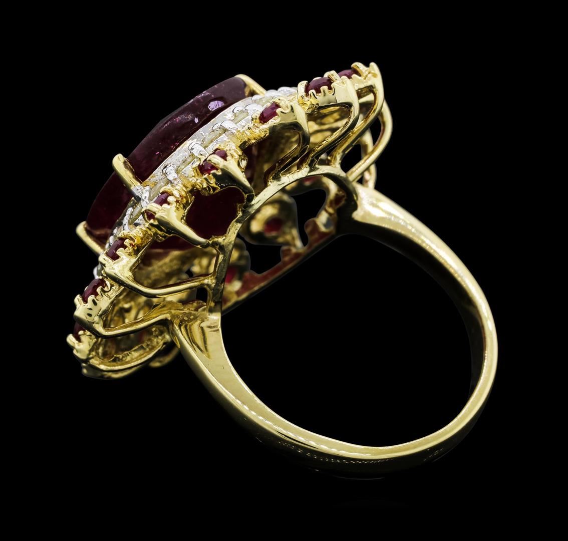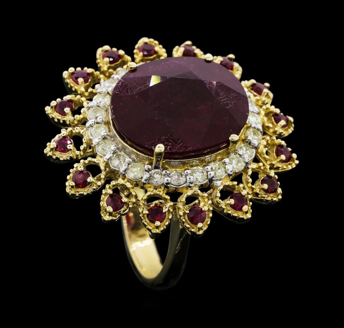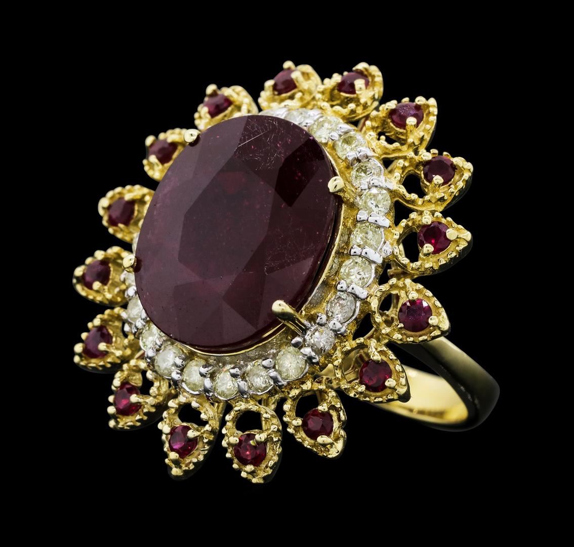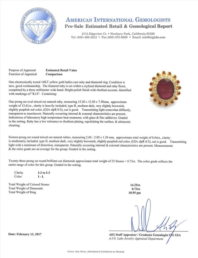 One electronically tested 14KT yellow gold ladies cast ruby and diamond ring. The featured ruby is set within a stylized diamond and ruby floret, completed by a three millimeter wide band. Bright polish finish with rhodium accents. Identified with markings of "K14". Condition is new, good workmanship. Containing: One prong set oval mixed cut natural ruby, measuring 15.20 x 12.50 x 7.50mm, approximate weight of 13.61ct., clarity is heavily included, type II, medium dark, very slightly brownish, slightly purplish red color, (GIA slpR 6/3), cut is good. Transmitting light somewhat diffusely, transparent to translucent. Naturally occurring internal & external characteristics are present. Indications of laboratory high temperature heat treatment, with glass & flux additives. Graded in the setting. Ruby has a low tolerance to rhodium plating, repolishing the surface, & ultrasonic cleaning.Sixteen prong set round mixed cut natural rubies, measuring 2.00 - 2.00 x 1.30 mm, approximate total weight of 0.64ct., clarity is moderately included, type II, medium dark, very slightly brownish, slightly purplish red color, (GIA slpR 6/3), cut is good. Transmitting light with a minimum of distortion, transparent. Naturally occurring internal & external characteristics are present. Measurements & the color grade are an average for the group. Graded in the setting.Twenty-Three prong set round brilliant cut diamonds approximate total weight of 23 Stones = 0.73ct. The color grade reflects the entire range of color for this group. Graded in the setting. Clarity: I-2 to I-3. Color: I - L. Total Weight of Colored Stones 14.25ct. Total Weight of Diamonds 0.73ct. Total Weight of Ring 10.95gm. AIG Appraised.