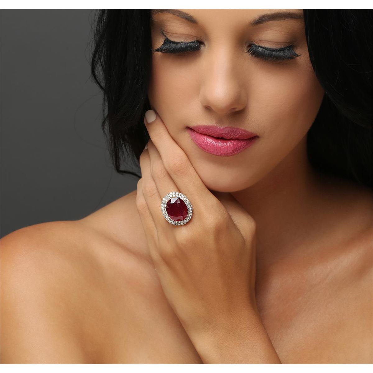 One electronically tested 14KT yellow gold ladies combination cast & assembled ruby and diamond ring with a flat shank with a bright polish finish. Identified with markings of "K14". Condition is new. Containing: One prong set oval modified brilliant cut natural ruby, measuring 16.38 x 13.83 x 7.91mm, approximate weight of 14.44ct., clarity is heavily included, type II, medium dark, moderately strong, strongly purplish red color, (GIA stpR 6/4), cut is good. Eighty-Four prong set round brilliant cut diamonds, measuring 1.70 - 1.50 x 0.96mm (depth est.) approximate total weight of 84 Stones = 1.25ct. Clarity: SI-1 to I-1. Color: I - J, Cut is Good. Colored gemstones are presumed to have been subjected to commonly used enhancement processes. All diamonds and colored gemstones are graded in the mounting, unless otherwise stated. Total Weight of Colored Stones 14.44ct. Total Weight of Diamonds 1.25ct. Total Weight of Ring 12.10 grams. GGL Appraised at $8,770.00.