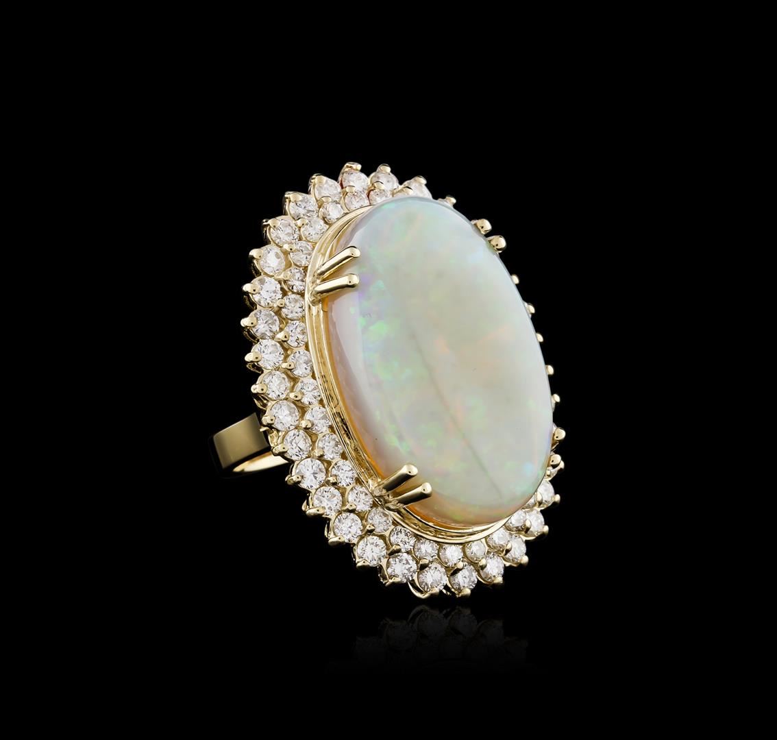 One electronically tested 14KT yellow gold ladies cast opal and diamond ring with a flat shank with a bright polish finish. Identified with markings of "K14". Condition is new. Containing: One white opal that is cut in a oval shape and is prong set, measuring 27.24 mm long x 17.00 mm wide, and 7.00 mm thick and the approximate weight is 14.73 carats. The opal has a somewhat bright, green only play of color (fire) in a flashfire pattern; a medium dome; a good cut; no inclusions; consistent in its brightness and pattern; and is somewhat directional. Thirty-Four prong set round brilliant cut diamonds, measuring 2.50 - 2.50 x 1.50mm (depth est.) approximate total weight of 34 Stones = 1.94ct. Clarity of SI-1 to SI-2, Color of I - J, Cut is Good. Thirty-Four prong set round brilliant cut diamonds, measuring 2.00 - 2.00 x 1.20mm (depth est.) approximate total weight of 34 Stones = 0.99ct. Clarity of SI-1 to SI-2, Color of I - J, Cut is Good. All diamonds and colored gemstones are graded in the mounting, unless otherwise stated. Colored gemstones are presumed to have been subjected to commonly used enhancement processes. Total Weight of Diamonds 2.93ct. Total Weight of Opals 14.73ct. Total Weight of Ring 16.90 grams. GGL Appraised at $9,630.00.