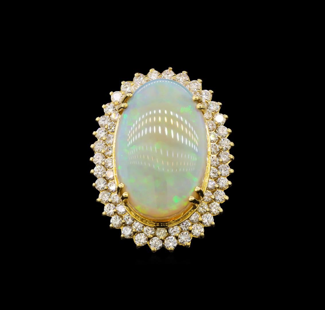 One electronically tested 14KT yellow gold ladies cast opal and diamond ring with a flat shank with a bright polish finish. Identified with markings of "K14". Condition is new. Containing: One white opal that is cut in a oval shape and is prong set, measuring 27.24 mm long x 17.00 mm wide, and 7.00 mm thick and the approximate weight is 14.73 carats. The opal has a somewhat bright, green only play of color (fire) in a flashfire pattern; a medium dome; a good cut; no inclusions; consistent in its brightness and pattern; and is somewhat directional. Thirty-Four prong set round brilliant cut diamonds, measuring 2.50 - 2.50 x 1.50mm (depth est.) approximate total weight of 34 Stones = 1.94ct. Clarity of SI-1 to SI-2, Color of I - J, Cut is Good. Thirty-Four prong set round brilliant cut diamonds, measuring 2.00 - 2.00 x 1.20mm (depth est.) approximate total weight of 34 Stones = 0.99ct. Clarity of SI-1 to SI-2, Color of I - J, Cut is Good. All diamonds and colored gemstones are graded in the mounting, unless otherwise stated. Colored gemstones are presumed to have been subjected to commonly used enhancement processes. Total Weight of Diamonds 2.93ct. Total Weight of Opals 14.73ct. Total Weight of Ring 16.90 grams. GGL Appraised at $9,630.00.