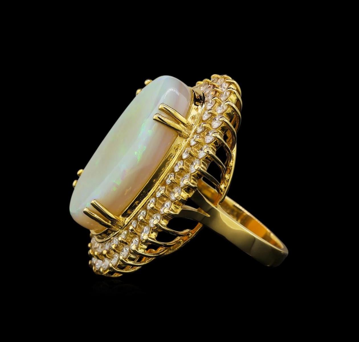 One electronically tested 14KT yellow gold ladies cast opal and diamond ring with a flat shank with a bright polish finish. Identified with markings of "K14". Condition is new. Containing: One white opal that is cut in a oval shape and is prong set, measuring 27.24 mm long x 17.00 mm wide, and 7.00 mm thick and the approximate weight is 14.73 carats. The opal has a somewhat bright, green only play of color (fire) in a flashfire pattern; a medium dome; a good cut; no inclusions; consistent in its brightness and pattern; and is somewhat directional. Thirty-Four prong set round brilliant cut diamonds, measuring 2.50 - 2.50 x 1.50mm (depth est.) approximate total weight of 34 Stones = 1.94ct. Clarity of SI-1 to SI-2, Color of I - J, Cut is Good. Thirty-Four prong set round brilliant cut diamonds, measuring 2.00 - 2.00 x 1.20mm (depth est.) approximate total weight of 34 Stones = 0.99ct. Clarity of SI-1 to SI-2, Color of I - J, Cut is Good. All diamonds and colored gemstones are graded in the mounting, unless otherwise stated. Colored gemstones are presumed to have been subjected to commonly used enhancement processes. Total Weight of Diamonds 2.93ct. Total Weight of Opals 14.73ct. Total Weight of Ring 16.90 grams. GGL Appraised.