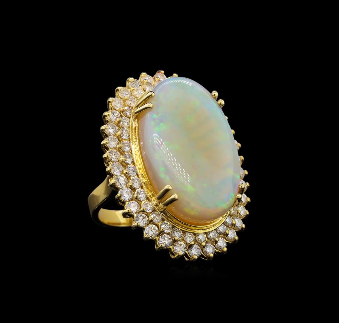 One electronically tested 14KT yellow gold ladies cast opal and diamond ring with a flat shank with a bright polish finish. Identified with markings of "K14". Condition is new. Containing: One white opal that is cut in a oval shape and is prong set, measuring 27.24 mm long x 17.00 mm wide, and 7.00 mm thick and the approximate weight is 14.73 carats. The opal has a somewhat bright, green only play of color (fire) in a flashfire pattern; a medium dome; a good cut; no inclusions; consistent in its brightness and pattern; and is somewhat directional. Thirty-Four prong set round brilliant cut diamonds, measuring 2.50 - 2.50 x 1.50mm (depth est.) approximate total weight of 34 Stones = 1.94ct. Clarity of SI-1 to SI-2, Color of I - J, Cut is Good. Thirty-Four prong set round brilliant cut diamonds, measuring 2.00 - 2.00 x 1.20mm (depth est.) approximate total weight of 34 Stones = 0.99ct. Clarity of SI-1 to SI-2, Color of I - J, Cut is Good. All diamonds and colored gemstones are graded in the mounting, unless otherwise stated. Colored gemstones are presumed to have been subjected to commonly used enhancement processes. Total Weight of Diamonds 2.93ct. Total Weight of Opals 14.73ct. Total Weight of Ring 16.90 grams. GGL Appraised.