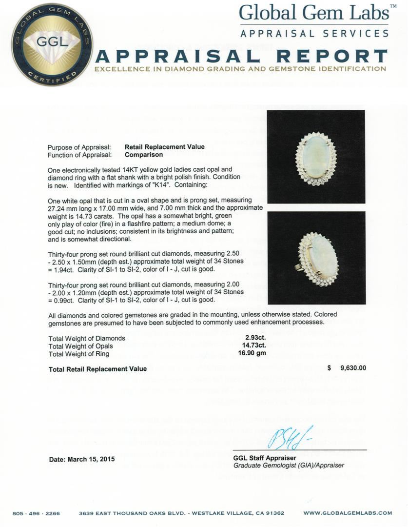 One electronically tested 14KT yellow gold ladies cast opal and diamond ring with a flat shank with a bright polish finish. Identified with markings of "K14". Condition is new. Containing: One white opal that is cut in a oval shape and is prong set, measuring 27.24 mm long x 17.00 mm wide, and 7.00 mm thick and the approximate weight is 14.73 carats. The opal has a somewhat bright, green only play of color (fire) in a flashfire pattern; a medium dome; a good cut; no inclusions; consistent in its brightness and pattern; and is somewhat directional. Thirty-Four prong set round brilliant cut diamonds, measuring 2.50 - 2.50 x 1.50mm (depth est.) approximate total weight of 34 Stones = 1.94ct. Clarity of SI-1 to SI-2, Color of I - J, Cut is Good. Thirty-Four prong set round brilliant cut diamonds, measuring 2.00 - 2.00 x 1.20mm (depth est.) approximate total weight of 34 Stones = 0.99ct. Clarity of SI-1 to SI-2, Color of I - J, Cut is Good. All diamonds and colored gemstones are graded in the mounting, unless otherwise stated. Colored gemstones are presumed to have been subjected to commonly used enhancement processes. Total Weight of Diamonds 2.93ct. Total Weight of Opals 14.73ct. Total Weight of Ring 16.90 grams. GGL Appraised.