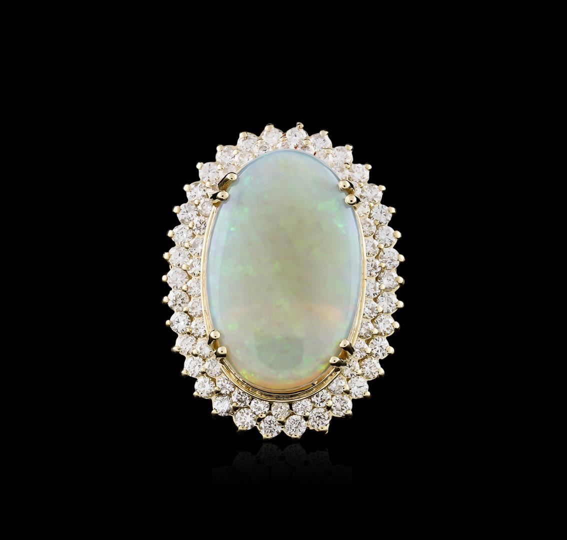 One electronically tested 14KT yellow gold ladies cast opal and diamond ring with a flat shank with a bright polish finish. Identified with markings of "K14". Condition is new. Containing: One white opal that is cut in a oval shape and is prong set, measuring 27.24 mm long x 17.00 mm wide, and 7.00 mm thick and the approximate weight is 14.73 carats. The opal has a somewhat bright, green only play of color (fire) in a flashfire pattern; a medium dome; a good cut; no inclusions; consistent in its brightness and pattern; and is somewhat directional. Thirty-Four prong set round brilliant cut diamonds, measuring 2.50 - 2.50 x 1.50mm (depth est.) approximate total weight of 34 Stones = 1.94ct. Clarity of SI-1 to SI-2, Color of I - J, Cut is Good. Thirty-Four prong set round brilliant cut diamonds, measuring 2.00 - 2.00 x 1.20mm (depth est.) approximate total weight of 34 Stones = 0.99ct. Clarity of SI-1 to SI-2, Color of I - J, Cut is Good. All diamonds and colored gemstones are graded in the mounting, unless otherwise stated. Colored gemstones are presumed to have been subjected to commonly used enhancement processes. Total Weight of Diamonds 2.93ct. Total Weight of Opals 14.73ct. Total Weight of Ring 16.90 grams. GGL Appraised at $9,630.00.