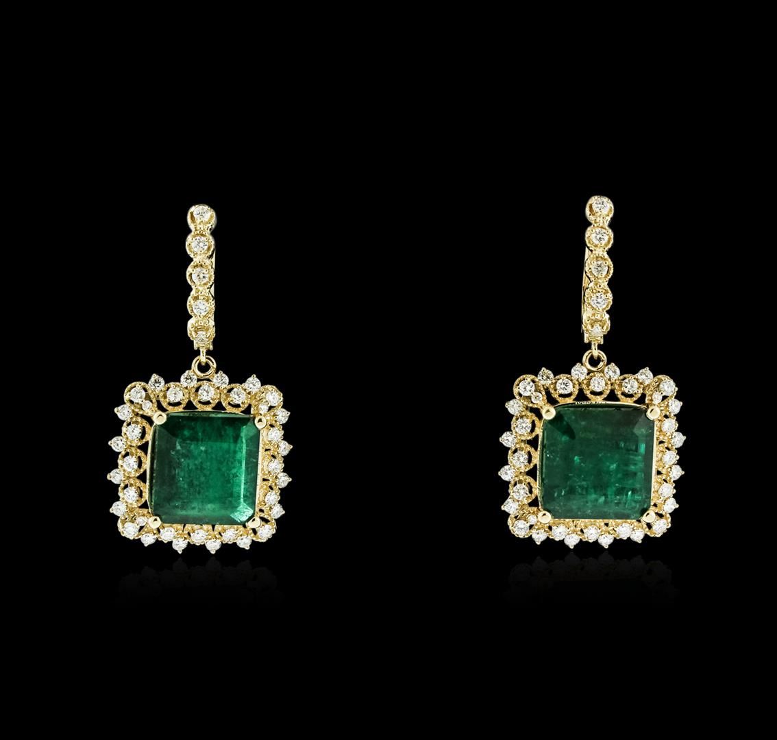 One pair electronically tested 14KT yellow gold ladies cast emerald and diamond earrings with hinged clip backs with a bright polish finish. Identified with markings of "14K". Condition is new. Containing: One prong set emerald standard step cut natural emerald, measuring 13.09 x 11.95 x 5.20mm, approximate total weight of 5.97ct., clarity is severely included, type III, medium, moderately strong, green color, (GIA G 5/4)One prong set emerald standard step cut natural emerald, measuring 13.12 x 11.97 x 7.60mm, approximate weight of 8.77ct., clarity is severely included, type III, medium, moderately strong, green color, (GIA G 5/4)Eighty-Two prong set round brilliant cut diamonds, measuring 1.70 - 1.20 x 0.87mm (depth est.) approximate total weight of 82 Stones = 0.91ct. Clarity: SI-2 to I-2. Color: I - J, Cut is Good. Colored gemstones are presumed to have been subjected to commonly used enhancement processes. All diamonds and colored gemstones are graded in the mounting, unless otherwise stated. Total Weight of Colored Stones 14.74ct. Total Weight of Diamonds 0.91ct. Total Weight of Earrings 13.70 grams. GGL Appraised at $8,935.00.