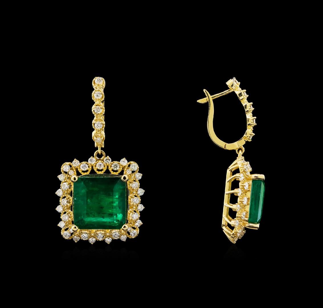 One pair electronically tested 14KT yellow gold ladies cast emerald and diamond earrings with hinged clip backs with a bright polish finish. Identified with markings of "14K". Condition is new. Containing: One prong set emerald standard step cut natural emerald, measuring 13.09 x 11.95 x 5.20mm, approximate total weight of 5.97ct., clarity is severely included, type III, medium, moderately strong, green color, (GIA G 5/4)One prong set emerald standard step cut natural emerald, measuring 13.12 x 11.97 x 7.60mm, approximate weight of 8.77ct., clarity is severely included, type III, medium, moderately strong, green color, (GIA G 5/4)Eighty-Two prong set round brilliant cut diamonds, measuring 1.70 - 1.20 x 0.87mm (depth est.) approximate total weight of 82 Stones = 0.91ct. Clarity: SI-2 to I-2. Color: I - J, Cut is Good. Colored gemstones are presumed to have been subjected to commonly used enhancement processes. All diamonds and colored gemstones are graded in the mounting, unless otherwise stated. Total Weight of Colored Stones 14.74ct. Total Weight of Diamonds 0.91ct. Total Weight of Earrings 13.70 grams. GGL Appraised at $8,935.00.