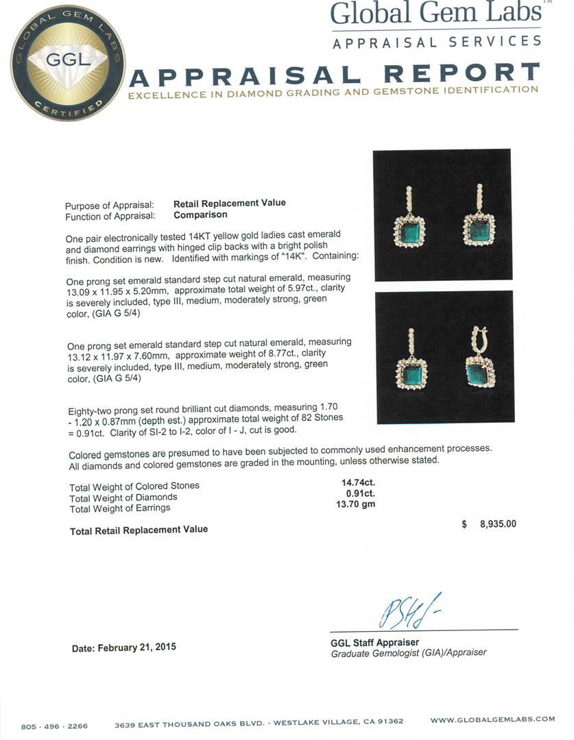 One pair electronically tested 14KT yellow gold ladies cast emerald and diamond earrings with hinged clip backs with a bright polish finish. Identified with markings of "14K". Condition is new. Containing: One prong set emerald standard step cut natural emerald, measuring 13.09 x 11.95 x 5.20mm, approximate total weight of 5.97ct., clarity is severely included, type III, medium, moderately strong, green color, (GIA G 5/4)One prong set emerald standard step cut natural emerald, measuring 13.12 x 11.97 x 7.60mm, approximate weight of 8.77ct., clarity is severely included, type III, medium, moderately strong, green color, (GIA G 5/4)Eighty-Two prong set round brilliant cut diamonds, measuring 1.70 - 1.20 x 0.87mm (depth est.) approximate total weight of 82 Stones = 0.91ct. Clarity: SI-2 to I-2. Color: I - J, Cut is Good. Colored gemstones are presumed to have been subjected to commonly used enhancement processes. All diamonds and colored gemstones are graded in the mounting, unless otherwise stated. Total Weight of Colored Stones 14.74ct. Total Weight of Diamonds 0.91ct. Total Weight of Earrings 13.70 grams. GGL Appraised at $8,935.00.