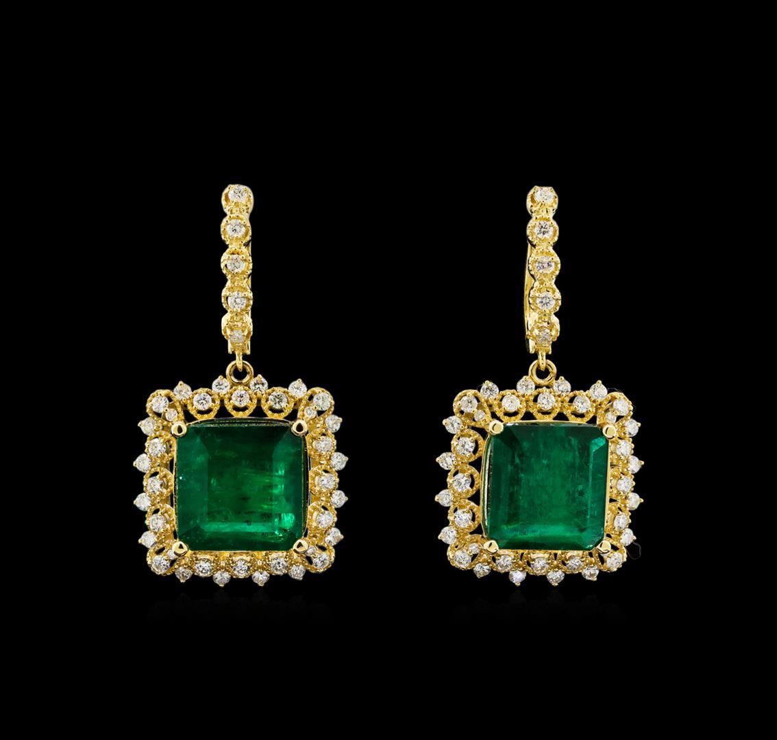 One pair electronically tested 14KT yellow gold ladies cast emerald and diamond earrings with hinged clip backs with a bright polish finish. Identified with markings of "14K". Condition is new. Containing: One prong set emerald standard step cut natural emerald, measuring 13.09 x 11.95 x 5.20mm, approximate total weight of 5.97ct., clarity is severely included, type III, medium, moderately strong, green color, (GIA G 5/4)One prong set emerald standard step cut natural emerald, measuring 13.12 x 11.97 x 7.60mm, approximate weight of 8.77ct., clarity is severely included, type III, medium, moderately strong, green color, (GIA G 5/4)Eighty-Two prong set round brilliant cut diamonds, measuring 1.70 - 1.20 x 0.87mm (depth est.) approximate total weight of 82 Stones = 0.91ct. Clarity: SI-2 to I-2. Color: I - J, Cut is Good. Colored gemstones are presumed to have been subjected to commonly used enhancement processes. All diamonds and colored gemstones are graded in the mounting, unless otherwise stated. Total Weight of Colored Stones 14.74ct. Total Weight of Diamonds 0.91ct. Total Weight of Earrings 13.70 grams. GGL Appraised.