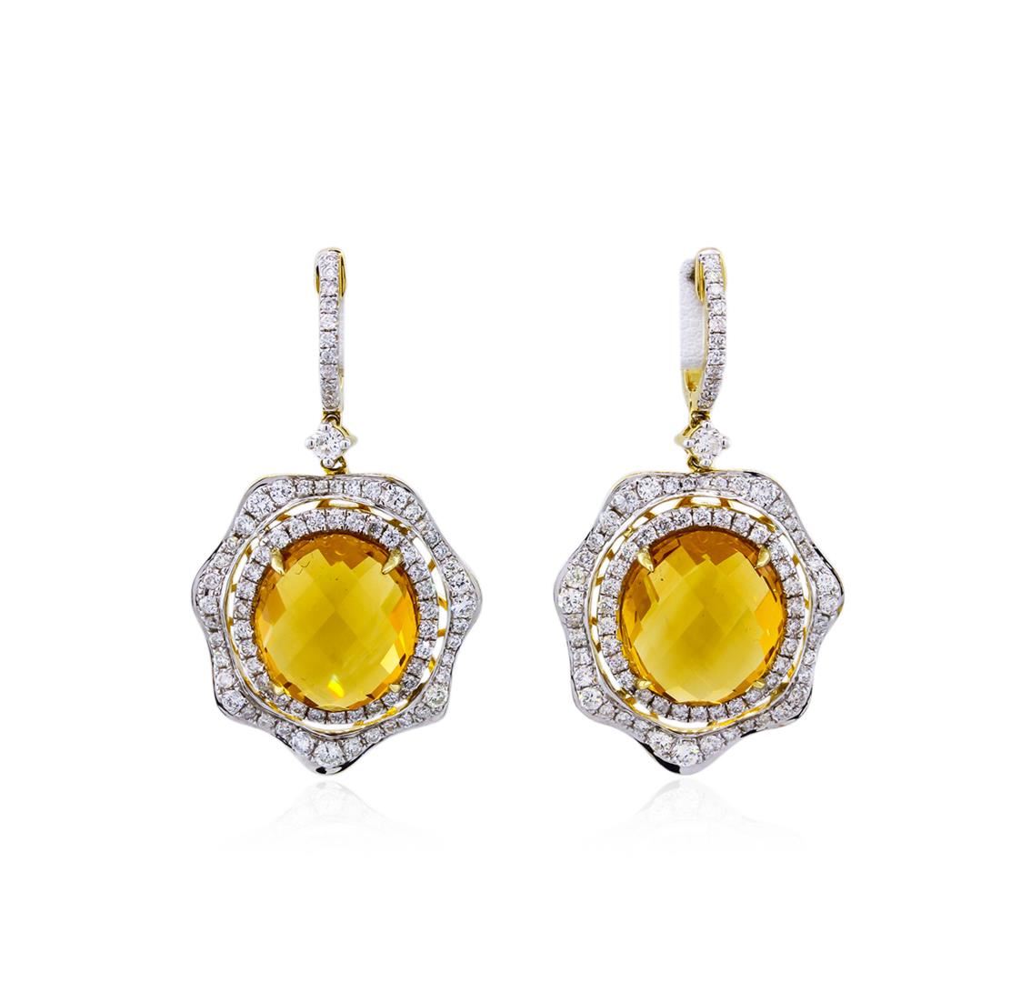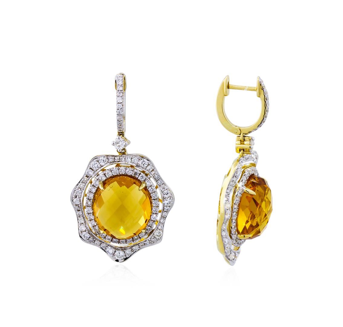 Turn heads with these elegant citrine and diamond dangle earrings! They feature 14.91 carats of beautiful citrine gemstones intricately framed by one hundred and sixty-four round diamonds totaling 1.88 carats. Total weight of earrings is 9.05 grams. Design is meant for pierced ears.