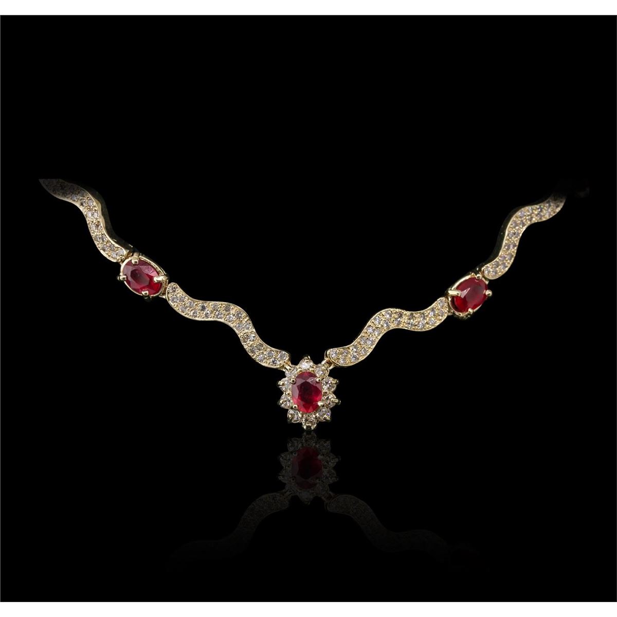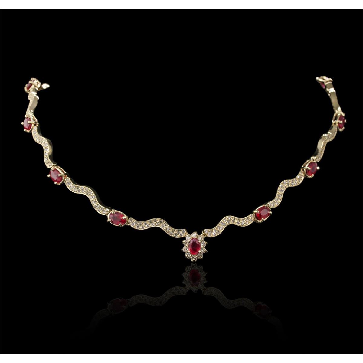 One electronically tested 14KT yellow gold Ladies combination cast & assembled necklace with a hidden box clasp with a bright polish finish. Condition is new. Measurements: 18" in length. Identified with markings of "14K". Containing: Thirteen prong set oval modified brilliant cut natural rubies, measuring 7.07 x 5.25 x 3.41mm, approximate. Total Weight of 14.94ct., clarity is heavily included, type II, medium dark, moderately strong, strongly purplish red color, (GIA stpR 6/4), cut is good. Colored gemstones are presumed to have been subjected to commonly used color/clarity enhancement processes. Ten prong set round brilliant cut diamonds, measuring 2.50 - 2.50 x 1.50mm (depth est.) approximate. Total Weight of 10 Stones = 0.57ct. Clarity: I-1 to I-2. Color: K - L, Cut is Good. Three Hundred Twenty-Two prong set round brilliant cut diamonds, measuring 1.50 - 1.50 x 0.90mm (depth est.) approximate. Total Weight of 322 Stones = 4.30ct. Clarity: I-1 to I-2. Color: K - L, Cut is Good. Total Weight of Colored Stones 14.94ct. Total Weight of Diamonds 4.87ct. Total Weight of Necklace 33.70 grams. GGL Appraised at $43,815.00.