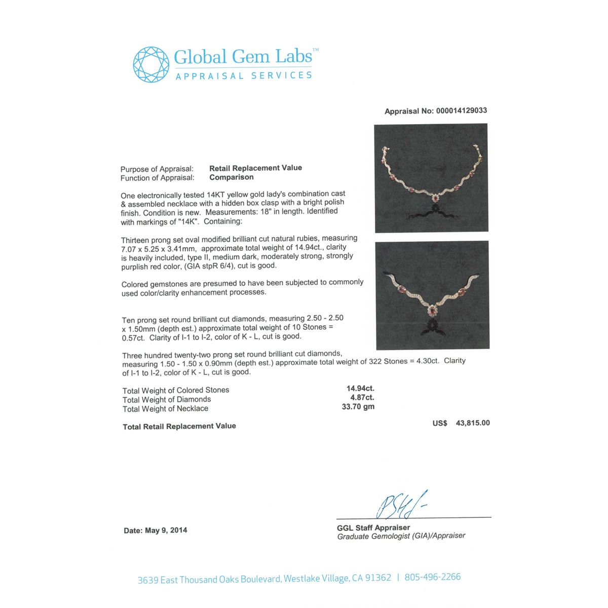 One electronically tested 14KT yellow gold Ladies combination cast & assembled necklace with a hidden box clasp with a bright polish finish. Condition is new. Measurements: 18" in length. Identified with markings of "14K". Containing: Thirteen prong set oval modified brilliant cut natural rubies, measuring 7.07 x 5.25 x 3.41mm, approximate. Total Weight of 14.94ct., clarity is heavily included, type II, medium dark, moderately strong, strongly purplish red color, (GIA stpR 6/4), cut is good. Colored gemstones are presumed to have been subjected to commonly used color/clarity enhancement processes. Ten prong set round brilliant cut diamonds, measuring 2.50 - 2.50 x 1.50mm (depth est.) approximate. Total Weight of 10 Stones = 0.57ct. Clarity: I-1 to I-2. Color: K - L, Cut is Good. Three Hundred Twenty-Two prong set round brilliant cut diamonds, measuring 1.50 - 1.50 x 0.90mm (depth est.) approximate. Total Weight of 322 Stones = 4.30ct. Clarity: I-1 to I-2. Color: K - L, Cut is Good. Total Weight of Colored Stones 14.94ct. Total Weight of Diamonds 4.87ct. Total Weight of Necklace 33.70 grams. GGL Appraised at $43,815.00.