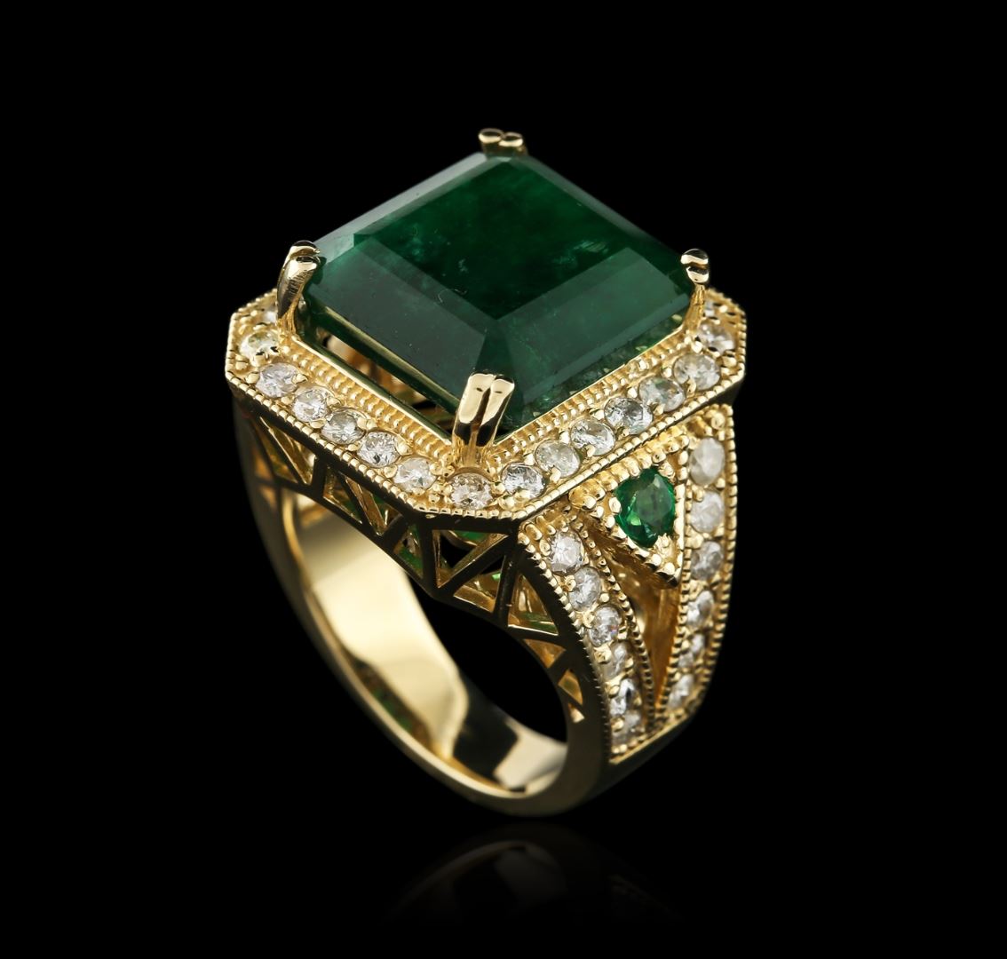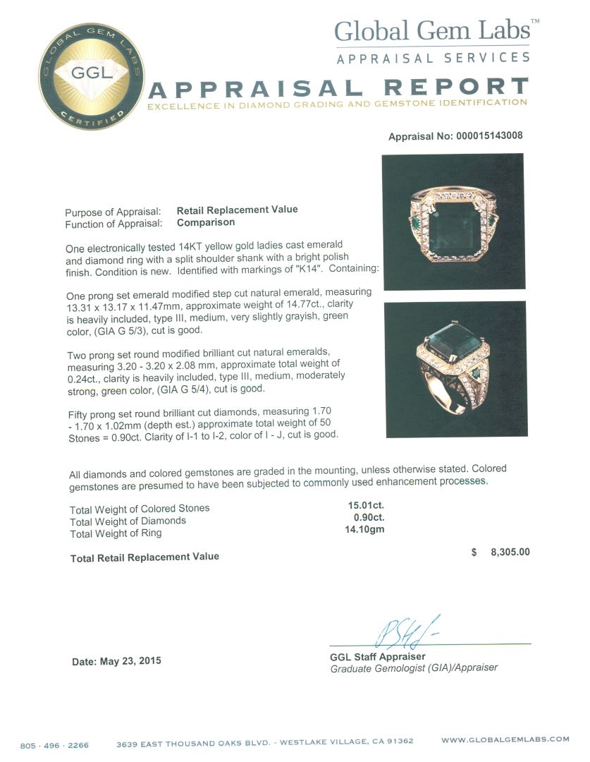 One electronically tested 14KT yellow gold ladies cast emerald and diamond ring with a split shoulder shank with a bright polish finish. Identified with markings of "K14". Condition is new. Containing: One prong set emerald modified step cut natural emerald, measuring 13.31 x 13.17 x 11.47mm, approximate weight of 14.77ct., clarity is heavily included, type III, medium, very slightly grayish, green color, (GIA G 5/3), cut is good. Two prong set round modified brilliant cut natural emeralds, measuring 3.20 - 3.20 x 2.08 mm, approximate total weight of 0.24ct., clarity is heavily included, type III, medium, moderately strong, green color, (GIA G 5/4), cut is good. Fifty prong set round brilliant cut diamonds, measuring 1.70 - 1.70 x 1.02mm (depth est.) approximate total weight of 50 Stones = 0.90ct. Clarity: I-1 to I-2. Color: I - J, Cut is Good. All diamonds and colored gemstones are graded in the mounting, unless otherwise stated. Colored gemstones are presumed to have been subjected to commonly used enhancement processes. Total Weight of Colored Stones 15.01ct. Total Weight of Diamonds 0.90ct. Total Weight of Ring 14.10 grams. GGL Appraised at $8,305.00.