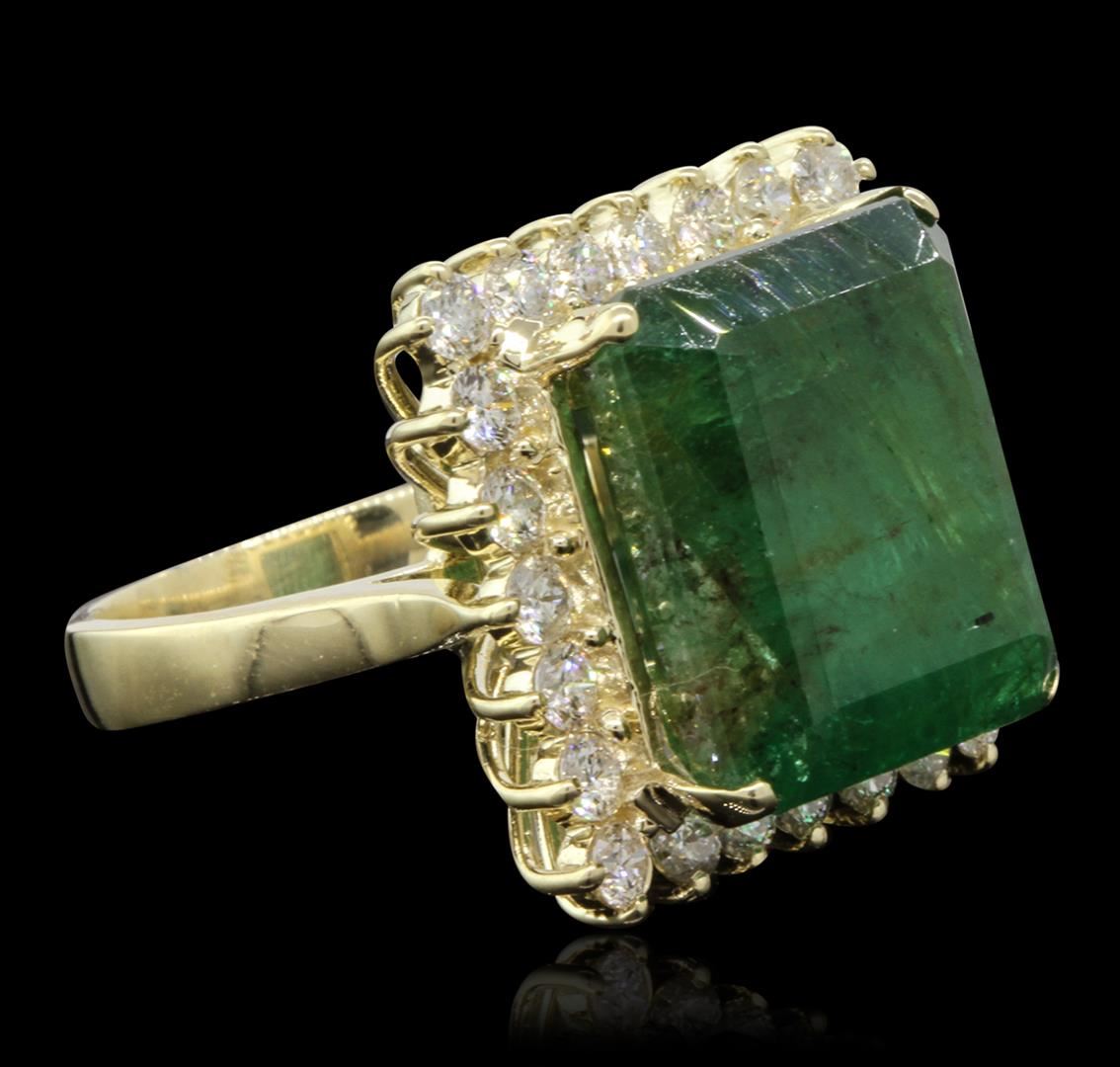 One electronically tested 14KT yellow gold Ladies combination cast & assembled ring with a bright polish finish. Condition is new. Identified with markings of "14K". Containing: One prong set emerald standard step cut natural emerald, measuring 16.00 x 13.90 x 9.30mm, approximate weight of 15.19ct., clarity is heavily included, type III, dark, moderately strong, green color, (GIA G 7/4), cut is good. Colored gemstones are presumed to have been subjected to commonly used and possible undetectable color/clarity enhancement processes. Twenty-Four prong set round brilliant cut diamonds, measuring 2.80 - 2.80 x 1.68mm (depth est.) approximate total weight of 24 Stones = 1.93ct. Clarity of SI-1 to SI-2, Color of I - J, Cut is Good. Total Weight of Colored Stones 15.19ct. Total Weight of Diamonds 1.93ct. Total Weight of Ring 13.00gm. GGL Appraised at $33,170.00.